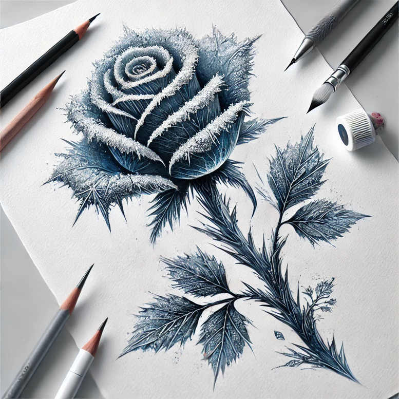 An AI-generated tattoo project concept presented as a hyper-detailed graphite-inspired study of a blue-toned rose. The composition centers on a single bloom, its petals edged with frost-like highlights and veined with fine lines that convey texture and depth. A long stem arches downward, terminating in a cluster of serrated leaves that mirror the razor-true precision of the bloom. The surrounding tools—pencil, pen, and a small ink bottle—frame the flower as a designer sketch rather than a finished tattoo, emphasizing its nature as a concept ready for translation into skin. The technique blends realistic shading with meticulous line work, using cross-hatching and subtle stippling to create volume, shadow, and luminosity in black and grey tones. The blue palette is achieved through tonal variation rather than color fill, giving the piece a cool, dramatic mood that reads as a versatile template for a tattoo design. The frost texture on the petals adds a graphic pattern element that can be echoed in line work on the skin, making this motif suitable for a cover-up or a bold standalone tattoo. In symbolism, the rose remains a universal emblem of beauty and resilience, while the frost introduces a notion of clarity, renewal, and permanence. This concept aligns with popular tattoo design keywords—tattoo, tattoo design, meaningful tattoos, fine line tattoo, lotus flower tattoo, infinity tattoo, tribal tattoo, rose tattoo design, small tattoos, flower tattoos, custom tattoo design, Japanese style tattoo, black and grey, realistic tattoo, body art, ink—ensuring it resonates with readers and search engines. If translated to skin, the piece would likely read as a crisp, high-contrast black and grey piece with soft gradients and crisp outlines, ideal for clients seeking a refined, nature-inspired tattoo with a modern, cool aesthetic. The pattern of veins on the leaves and the delicate frost on the petals provide visual rhythm, while the overarching silhouette remains elegant and legible across body placements.