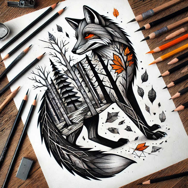 This AI-generated tattoo project concept features a fox silhouette fused with a stylized forest, rendered in a disciplined black and grey palette with selective orange leaf accents. The composition places the fox profile at the forefront, its gaze calm and resolute, while an intertwined grove of pines and bare branches rises along the torso and tail, creating a cohesive landscape that doubles as a bold pattern across the body. The technique emphasizes precise fine line tattoo work, crisp outlines, and smooth shading transitions from deep blacks to midtones, producing a graphic yet lifelike effect appropriate for wearable ink. The forest elements act as both backdrop and motif, with repeated tree silhouettes and leaf shapes establishing rhythm and depth, enabling a natural flow that can adapt to various placements such as the arm, back, or thigh. Orange leaves punctuate the grayscale field, guiding the eye to focal points on the chest and shoulders, while keeping the overall look restrained and timeless. Symbolically, the fox evokes cunning and adaptability, set against a forest’s cycle of growth and change, inviting interpretations around resilience, sanctuary, and the passage of seasons. For tattoo artists, this design serves as a versatile blueprint: the density of trees, leaf count, and line weight can be tuned to body contours without losing the iconic silhouette. The pattern-like forest weave also appeals to fans of pattern tattoos while remaining anchored in natural realism, aligning with styles from fine line to black and grey realism. Although the concept leans on a woodland motif, it remains a strong candidate for those seeking meaningful tattoos that convey personal narratives, and it can be expanded into a larger piece or condensed for smaller placements, preserving the core symbolism of nature and cunning. As an AI-generated tattoo project, it demonstrates how algorithmic artistry can yield market-ready ideas that blend animal imagery with landscape elements. The design keywords—tattoo, tattoo design, meaningful tattoos, fine line tattoo, lotus flower tattoo, infinity tattoo, tribal tattoo, rose tattoo design, small tattoos, flower tattoos, custom tattoo design, Japanese style tattoo, black and grey, realistic tattoo, body art, ink—signal its relevance across diverse portfolios, while its dark shading and strong silhouette make it an excellent cover-up option for fading ink, providing clear opportunity to reimagine a skin narrative with elegance and clarity.