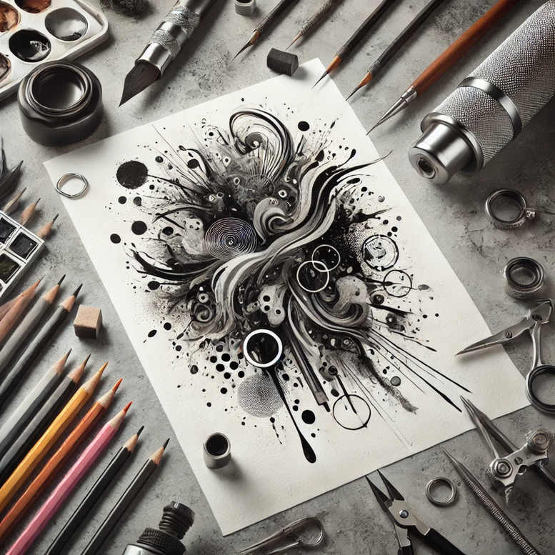 AI-generated tattoo project concept presents a bold black-and-grey composition built from an abstract ink splash rendered on a white sheet. Prominent ribbons of solid black carve through a field of circles, spirals, lines, and spray-like splatters, creating a dynamic pattern that reads as both controlled chaos and deliberate design. The central mass is anchored by sweeping curves, while stippled shading and fine line accents build tonal depth, offering transitions from near-absolute black to soft gray gradients suitable for a realistic tattoo look when scaled to skin. Surrounding studio tools—paper, pencil, brush, ink, and scissors—frame the concept, reminding the viewer this is a design idea for a real-world tattoo design. The meaning can be read as motion and energy, transformation and resilience, making it appealing to those seeking a meaningful tattoo design or a bold cover-up for previous work. The grayscale palette emphasizes texture and form over color, aligning with black and grey tattoo aesthetics and enabling versatile shading on larger canvases or intimate placements. Because the piece is highly graphic, it works well in several styles—from tribal or Japanese-tinged abstractions to modern fine-line interpretations—while the dense pattern both anchors the composition and invites customization. Circles and rings echo continuity and cycles, spirals suggest growth, and the interplay of saturated blacks with negative space supports a strong, legible silhouette on the skin. For cover-ups, the heavy black mass can obscure underlying ink, with the surrounding whitespace tuned to match skin tone and age of the original tattoo. Being an AI-generated concept, this design demonstrates how modern tattoo projects blend algorithmic creativity with client-driven tweaks, producing a flexible template for custom tattoo design, suitable for a lotus flower tattoo motif, a geometric black-and-grey piece, or a broad statement across the back or arm. In short, the artwork embraces pattern, ink, and form to deliver a compelling body art concept that doubles as a powerful cover-up-ready canvas and an inspiring starting point for tattoo artists and clients alike.
