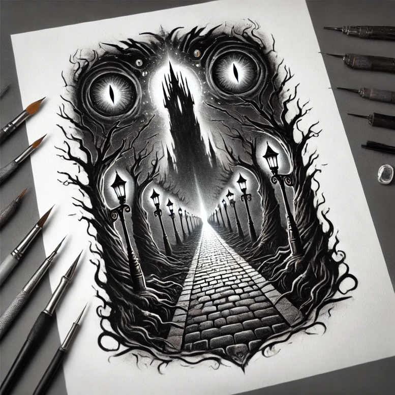 This black and grey tattoo design presents a moody, cinematic gothic scene rendered in fine line and bold shading. A cobblestone path recedes toward a distant, jagged castle silhouette, flanked by gnarled trees whose branches spiral inward to form a natural frame. Along the path, vintage street lamps punctuate the gloom with narrow pools of light, while two enlarged, watchful eyes sit high in the canopy, lending an otherworldly presence to the composition. The piece relies on dramatic contrast and meticulous linework to separate light from shadow, with crisp edgework on the cobblestones and trees to create a tactile, inked texture. The overall mood is one of mystery and journey, inviting interpretation about what lies beyond the looming fortress and who or what is watching from above. Technique-wise, the design balances fine line detailing for the trees and lamps with broad black saturations to anchor the scene, using negative space to suggest glow and distance. As a tattoo design, it reads as a narrative scene that can be placed on the back, chest, or thigh for a bold statement. The recurring pattern of lampposts and branching silhouettes gives the piece a cohesive rhythm, while the central vanishing point draws the eye through the work and can effectively cover underlying marks due to its strong black field surrounding the frame. Given its dark palette and substantial negative space, this concept is especially suitable as a cover-up piece, allowing old tattoos to be masked beneath a new, layered composition. For tattoo enthusiasts, this design blends the aesthetics of black and grey realism with a cinematic, illustrative approach that suits lovers of meaningful tattoos, fine line tattoo artistry, and custom tattoo design projects in a gothic or Japanese-inspired sensibility. In short, it is a robust body art concept that leverages contrast, silhouette, and symbolic imagery to deliver a striking, timeless tattoo design with strong narrative potential and cover-up viability.