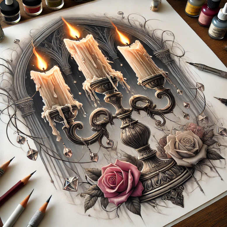 An AI-generated tattoo project concept that centers an ornate candelabrum as the main motif, flanked by three lit candles, a pink rose and a near-white rose at the base, with scattered diamond facets and an arching frame. Rendered in high-contrast black and grey with selective color on the rose, the piece blends realism with decorative linework, achieving a timeless feel suitable for a classic tattoo design. The candelabrum showcases baroque scrolls, urn shapes, and intricate engravings, while melted wax and flickering flames add warmth and motion to the composition. Diamonds drift around the central elements, catching light in precise facets that contrast with the soft petals of the roses; the surrounding vines and lattice lines create a delicate pattern that enriches texture without stealing focus from the candles and blossoms. The overall layout works well as a statement piece on the back or arm, yet can be scaled to a smaller forearm tattoo while preserving legibility and balance. Symbolically, light and memory are evoked by the candlelight, while the roses symbolize beauty and resilience, and the diamonds convey clarity and value—an elegant trio for meaningful tattoos and flower tattoo design enthusiasts. The technique emphasizes clean line work, smooth gradient shading, and careful control of negative space to ensure the image remains readable on skin in black and grey or with a hint of rose color for personalization. As an AI-generated tattoo project, this concept is ideal for portfolios, client inspiration, and as a platform for exploring fine line tattoo and traditional ornament within contemporary ink, with pattern-rich elements that invite repetition in sleeve or chest panels and adaptability to Japanese-style tattoo influences or realistic tattoo aesthetics. Artists can adjust line weight, shading, or color saturation to suit skin tone and placement.