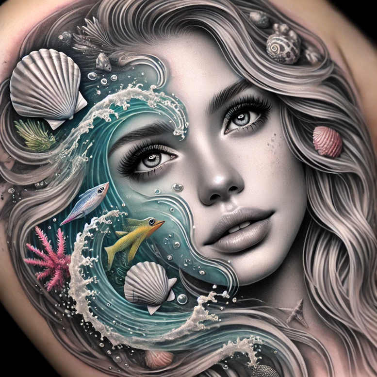 This is an AI-generated tattoo project, combining a near-photographic grayscale portrait with a flowing oceanic pattern. The focal point is a female face rendered in black and grey ink with meticulous shading that yields a lifelike gaze and soft, full lips. The hair is stylized into curling strands that morph into tidal waves, creating a seamless border between portrait and seascape. Intertwined within the wave are seashells, coral branches, and small fish, all executed with a precise mix of fine-line detailing and smooth gradient work to establish depth, motion, and rhythm. A deliberate teal highlight threads through the water, giving the scene a spark of color while preserving the overall monochrome aesthetic that makes the design versatile for black-and-grey tattoo work. The composition reads as a combined portrait and landscape—an artful tattoo design suitable for chest, sleeve, back, or calf applications—where negative space and line weight guide the eye across the piece. Meaning can be personal: the ocean as memory, resilience, or transformation, with the woman’s gaze anchoring the narrative and the wave motif signaling continual change. From a technique standpoint, the piece leans toward realism with Japanese-inspired line work, offering a modern, refined approach to body art and ink technique. In terms of audience, it targets meaningful tattoos, small tattoos that scale well, and custom tattoo design lovers who appreciate a fusion of portraiture and pattern. The pattern-like repetition of the water curves and shell motifs makes it a strong candidate for clients seeking a design that doubles as a cover-up if pre-existing ink is considered; however, the effectiveness of cover-up depends on the original markings and placement. Overall, the AI-generated concept demonstrates how tattoo design can merge natural imagery with a human focal point, delivering a unique, cohesive statement on skin while remaining adaptable to various skin tones and body areas.