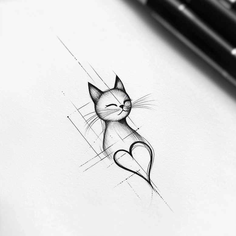 AI-generated tattoo concept describing a smiling cat with a heart motif drawn in fine-line technique with geometric accents. The composition centers on a poised cat whose arcs and light shading are rendered with delicate line work. A heart motif sits near the cat’s chest, its curves echoing the feline silhouette and forming a subtle focal point. A lattice of diagonal and cross-hatched lines slices through the image, adding a modern, abstract feel without overwhelming the main figures. The effect is clean, elegant, and highly adaptable for a small to medium tattoo on the wrist, ankle, or behind the shoulder. Technique emphasizes fine-line tattoo principles: precise, continuous lines, restrained shading, and careful line-weight variation to convey depth and personality while maintaining a light, airy appearance. The black-and-grey palette reinforces timeless aesthetics and makes the piece ideal for someone seeking a discreet yet expressive tattoo. In terms of symbolism, the cat represents independence and curiosity, the heart stands for affection and connection, and the geometric segments suggest structure and balance—three layers of meaning that combine into a meaningful tattoo design. The design can be inked as a standalone piece or integrated into a larger sleeve with complementary motifs. For those considering a cover-up, the bold contrast and simple shapes allow professional tattoo artists to adapt the lines to conceal older artwork while preserving the central cat-and-heart motif. As an AI-generated tattoo project, this concept demonstrates how digital sketches can translate into tattoo-ready line work, offering clients a reference for a custom tattoo design that is both delicate and expressive. Keywords such as tattoo, tattoo design, meaningful tattoos, fine line tattoo, lotus flower tattoo, infinity tattoo, tribal tattoo, rose tattoo design, small tattoos, flower tattoos, custom tattoo design, Japanese style tattoo, black and grey, realistic tattoo, body art, ink are woven throughout to help search visibility and contextualize the piece within contemporary tattoo culture. The graphic elements create a pattern-like rhythm that can be scaled up for larger canvases or adjusted for placement, while preserving the gentle character of the cat and the heart.