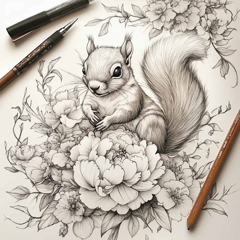 An elegant graphite concept presented as a tattoo-ready pencil sketch, this tattoo design presents a curious squirrel nestled among lush peony blossoms and curling foliage in black and grey. The piece relies on fine line work and soft shading to convey fur texture, petal delicacy, and leaf veins, creating depth while preserving a timeless, realistic feel. The composition centers on the squirrel standing among a dense bouquet, its fluffy tail arcing behind, eyes lively, and paws gently resting on a flower. Surrounding stems weave a natural frame that guides the eye from the creature to the blossoms and back again, creating a balanced layout suitable for forearm, calf, or shoulder placements. The peony cluster exudes lush volume; petals render as layered, almost sculptural forms with careful cross-hatching and stippling to suggest light catching the curves. The design nods to both botanical illustration and fine line traditions, with a focus on crisp contours that read well on skin while preserving subtle shading for a sense of realism. As a meaningful tattoo concept, the pairing conveys curiosity, growth, and beauty in a single motif, appealing to nature lovers and lovers of quiet imagery alike. The style leans into black and grey realism with botanical elegance, making it adaptable to other motifs such as lotus flower tattoo or rose tattoo design should the client wish to expand the piece. For smaller tattoos, the central squirrel can anchor a compact arrangement, while the surrounding florals can be extended for a larger sleeve or back piece without losing legibility. The design nods to Japanese style tattoo linework, blending naturalism with a hint of ornamental structure to suit a range of body art contexts. In terms of symbolism, the squirrel represents cleverness and preparedness, paired with peony’s associations with prosperity and honor, resulting in a meaningful tattoo design that resonates with personal storytelling. This concept is presented here as an AI-generated tattoo project concept, illustrating potential linework, composition, and ink strategy for professional applications, and can be translated into fine line tattoo projects, black and grey tattoos, or custom tattoo designs across various sizes.