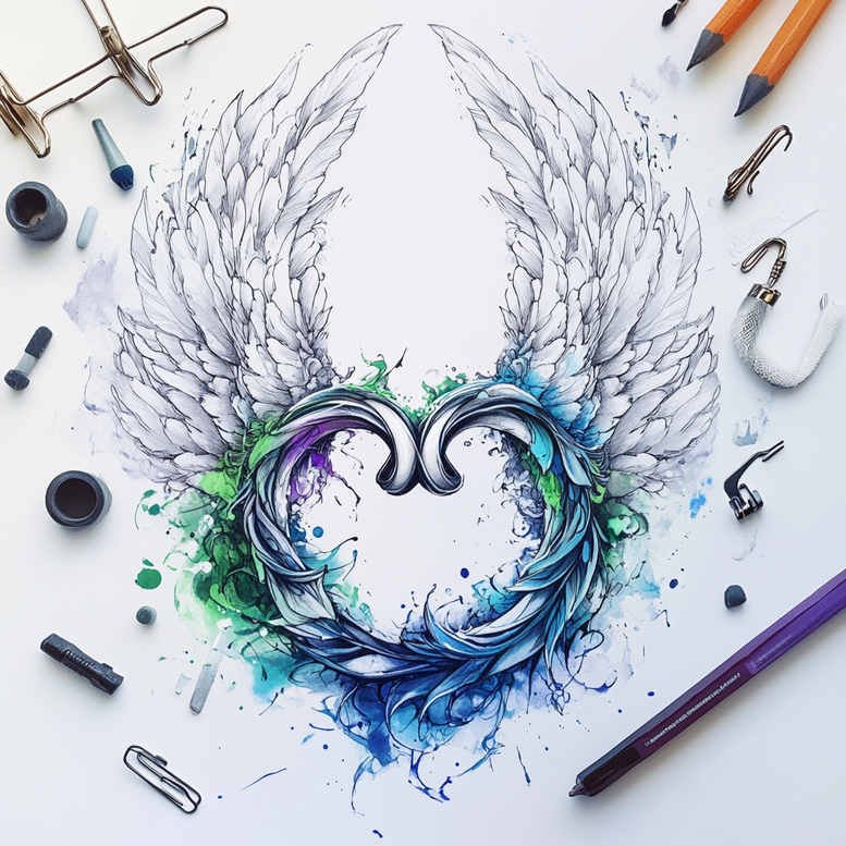 AI-generated tattoo project concept presenting a pair of stylized wings forming a heart, rendered in a loose watercolor style with precise ink lines. The composition centers on two symmetrical wing shapes that cradle a circular negative space, creating a heart-like silhouette. Feather pattern details are rendered with fine line work, adding texture as splashes of blue, teal, green, and purple radiate outward. The color palette injects life and movement, translating well to tattooing on forearms, shoulders, or chests, while remaining scalable for small tattoos. The surrounding watercolor wash acts as a dynamic backdrop that can be executed in black and grey or intensified into full color for a bold statement. Technically, the piece balances bold outlines with delicate shading to preserve detail when rendered in fine line or realistic tattoo styles. The feather pattern invites adaptation into Japanese style tattoo elements, tribal motifs, or rose tattoo design influences, offering a versatile path for a custom tattoo design that expresses ideas like freedom, protection, or renewal. The circular heart motif also harmonizes with infinity tattoo symbolism when extended with ornamental rings. The pattern-rich composition ensures strong legibility on skin and can be scaled for small tattoos or larger back pieces, while remaining clear at reduced sizes. If a cover-up is needed, the dense feather lines and watercolor washes provide robust masking when paired with darker inks. In sum, this concept demonstrates a modern body art approach with a watercolor aesthetic, blending painterly color with precise ink to yield a memorable tattoo design suitable for meaningful tattoos and a wide range of locations. It also leaves room to incorporate motifs such as lotus flower tattoo symbolism if desired.