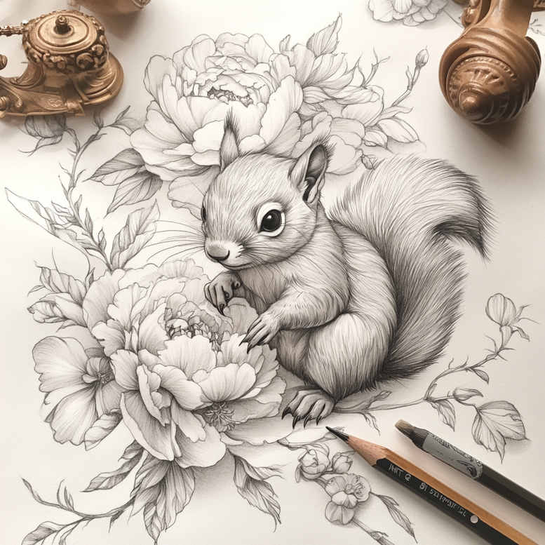 This is an AI-generated tattoo project rendered as a black-and-grey pencil study of a squirrel perched among peony blossoms. The composition fuses lifelike fur with the intricate layers of petals to create a pattern-rich scene that can function as a standalone tattoo or as a cohesive element for a sleeve or back piece. The technique mimics graphite drawing: fine lines define the squirrel’s whiskers and fur direction, while gradual tonal shifts and cross-hatching build depth in the petals and leaves. Subtle stippling adds texture in shaded areas, giving a believable, tactile feel that translates well to skin as a tattoo design. The squirrel’s bright eye and poised pose provide a focal point that suggests curiosity and resilience, while the peonies symbolize beauty, prosperity, and renewal; together they form a meaningful tattoo design for nature lovers and symbol enthusiasts alike. From a stylistic standpoint, the piece sits firmly in the black and grey spectrum with a realistic approach that emphasizes texture over color. The floral motif creates a pattern-like rhythm, offering versatility for wrapping around a limb or curving along the shoulder; it works well as a fine-line piece or as a larger design, and it can be adapted to accents in a Japanese-inspired or botanical sleeve. As an AI-generated concept, this project is intended for concept exploration and client brainstorming, with the understanding that final tattooing should be refined by a licensed artist to optimize linework, shading, and skin tone compatibility. In terms of SEO, this design aligns with tattoo design keywords such as tattoo, tattoo design, meaningful tattoos, fine line tattoo, lotus flower tattoo, infinity tattoo, tribal tattoo, rose tattoo design, small tattoos, flower tattoos, custom tattoo design, Japanese style tattoo, black and grey, realistic tattoo, body art, and ink, reinforcing its potential as a striking, versatile piece that balances whimsy and elegance while remaining suitable for various body placements.