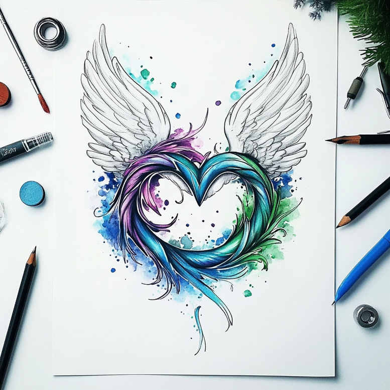 This AI-generated tattoo project concept presents a luminous rainbow heart with wings, rendered in a hybrid watercolor and line-work style on a clean white sheet. The central motif—an interwoven heart that pours color along its curves—is outlined in black ink to maintain crisp definition while the interior is filled with fluid washes in blue, turquoise, purple, and green. The wings extend upward in a graceful arc, their feathers drawn with fine-line precision that contrasts with the loose splashes of pigment around the form. The result is a dynamic design that balances energy and romance, making it suitable for modern body art applications. The composition invites various interpretation: the heart as a symbol of love and resilience, the wings as a sign of ascent and freedom, and the watercolor bleeds as a nod to spontaneity and personal growth. Skilled tattoo artists can adapt the piece into a small to mid-size tattoo or transform it into a larger back or shoulder piece by layering additional color gradients and line weight. When executed as a tattoo, the design reads as a meaningful tattoo with potential for further refinement through color calibration, shading, and texture. The image also nods to a blend of styles prominent in contemporary tattoo practice: a touch of fine-line tattoo for detail, a hint of Japanese style influence in the winged motif, and the broad color vocabulary typical of watercolor-inspired pieces. While this is presented as a concept, it is well-suited as a stand-alone tattoo design or as a component of a larger bodysuit, and it can be reimagined in black-and-grey if a more subdued aesthetic is preferred. As an AI-generated tattoo project, it demonstrates how digital concept art can translate into tangible ink ideas, offering a robust starting point for meaningful tattoos, small tattoos, flower tattoos, and other custom tattoo design explorations. Keywords such as tattoo, tattoo design, meaningful tattoos, fine line tattoo, lotus flower tattoo, infinity tattoo, tribal tattoo, rose tattoo design, small tattoos, flower tattoos, custom tattoo design, Japanese style tattoo, black and grey, realistic tattoo, body art, and ink are woven into the narrative to reflect the design’s versatility and the evolving nature of modern tattoo artistry.