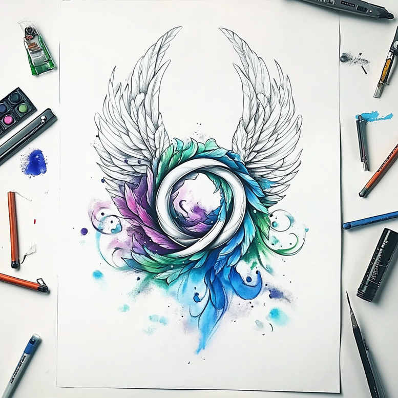 A richly rendered winged circle tattoo concept created as an AI-generated tattoo project, balancing precise linework with expressive watercolor washes. The central motif is a circular ring that seamlessly blends into sweeping feathered wings, conveying motion, freedom, and a sense of infinity. The artist’s hand is evident in the fine lines that outline the ring and wing edges, contrasted by soft, translucent color blends that bleed beyond the boundaries of the form, producing a luminous, energetic composition. The color palette integrates teal, emerald, violet, and cobalt hues, tempered by white highlights and gentle splashes that simulate a living watercolor effect. Symbolically, the circle suggests continuity and resilience, while the wings imply ascent and aspiration—an ideal pairing for meaningful tattoos and personal mantras. Technically, the piece demonstrates a fusion of fine line technique with bold color application, enabling both crisp definitions and organic movement, making it adaptable for various body canvases from small scripts to larger back pieces. The concept suits modern trends in tattoo design that favor dynamic linework, color-driven symbolism, and versatile applicability across Japanese-inspired or contemporary styles. For those considering a cover-up, this design offers strong potential to mask existing ink through layered color and negative space while preserving the winged circle’s clarity. As a digital-to-tattoo blueprint, it serves as a robust starting point for a custom tattoo design, showcasing how ink, light, and texture interact on skin to create a striking body art statement. Keywords such as tattoo, tattoo design, meaningful tattoos, fine line tattoo, lotus flower tattoo, infinity tattoo, tribal tattoo, rose tattoo design, small tattoos, flower tattoos, custom tattoo design, Japanese style tattoo, black and grey, realistic tattoo, and ink are embedded to reflect its breadth and relevance in contemporary tattoo portfolios.