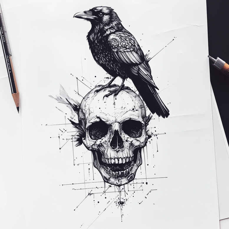 This AI-generated tattoo project concept features a monochrome skull and crow in a refined black and grey fine line style. The central motif shows a realistically rendered skull shaded with cross-hatching to convey bone texture, while a crow perches atop the cranium with delicate feather work that contrasts with the skull’s bold shading. Surrounding elements include geometric line work, dots, and splatter accents that create a pattern-driven backdrop, giving the design a contemporary graphic punch without compromising legibility for small tattoos. The composition blends realism-inspired texture with abstract geometry, fitting for a tattoo design on the shoulder, chest, back, or forearm, whether as a stand-alone piece or as part of a larger body art project. Symbolically, the skull stands for mortality and resilience, the crow for intelligence and adaptability, and the interwoven lines evoke fate and connection. The black and grey palette preserves a timeless look, while crisp line work ensures readability as the piece scales from a large statement tattoo to a refined small tattoo design. For collectors of meaningful tattoos, this motif invites customization in placement, scale, and shading density, and it can be adapted to echo Japanese style tattoo or Western tribal and realism influences, including lotus flower tattoo or rose tattoo design motifs if desired. As an AI-generated tattoo project concept, it demonstrates precise line control, balance, and pattern-led composition that align with current tattoo trends and ink artistry, making it a strong candidate for a custom tattoo design that tells a wearer’s story. If cover-up scenarios are needed, the modular line system and high-contrast shading can facilitate concealment of previous work while preserving the skull-and-crow symbolism. The piece also invites further exploration of meaningful tattoo ideas, such as infinity tattoos or small flower tattoos, allowing artists to tailor the motif to a client’s narrative while maintaining a unified, ink-ready aesthetic.