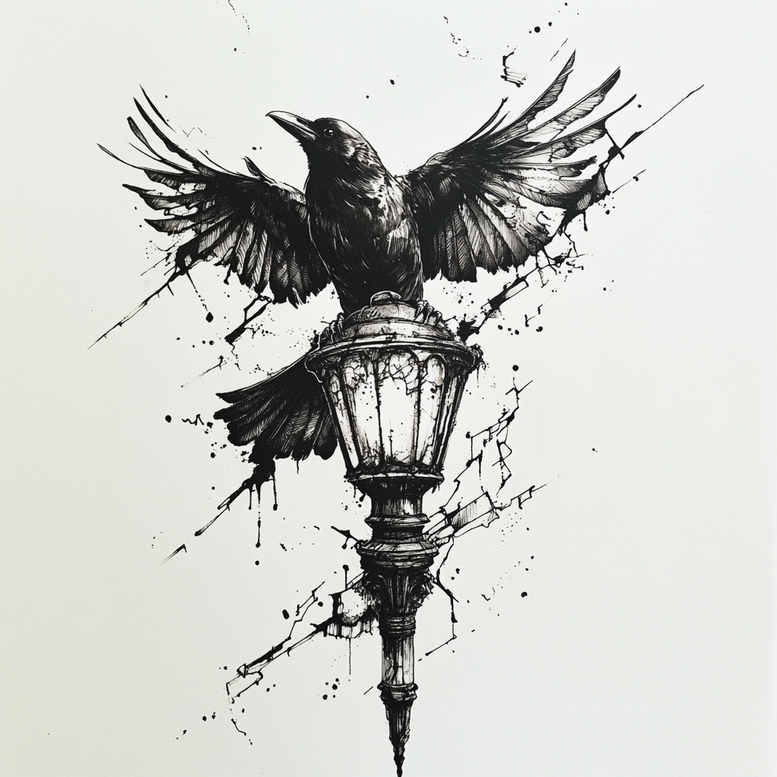 This AI-generated tattoo project showcases a crow perched on a vintage lamp post, rendered in bold black and grey ink with refined fine-line detailing. The central silhouette is defined by crisp linework on the crow’s ruffled feathers and the lamp’s ornate glass housing, while intentional splatters radiate outward to create motion and texture, giving the composition a contemporary graphic edge. The balanced use of negative space against a pale canvas enhances clarity when translated to skin, making it suitable for a medium to large format on the upper arm or back, with the lamp and bird acting as a strong single focal point. Symbolically, the crow embodies transformation, intelligence, and resilience, while the lamp post suggests guidance and illumination in darkness; together they weave a concise narrative about finding light within adversity. The ink splatter pattern adds a tactile layer of texture, supporting a dynamic aesthetic without compromising legibility, and it can be employed to blend edges when covering faded tattoos or unwanted markings. In terms of technique, the piece blends fine-line precision with bold silhouettes to achieve a realistic yet stylized look, suitable for a refined monochrome body art approach. The design embraces a modern trend toward black and grey realism, making it versatile for various placements while maintaining strong visual impact. As a genuine AI-generated tattoo project, it demonstrates how technology can inform precise outlines and cohesive compositions that translate well into durable, everyday wear. For readers and potential clients seeking meaningful tattoos with a subtle but dramatic vibe, this piece exemplifies how a dark, pattern-rich motif can serve effectively as a cover-up, offering both aesthetic appeal and practical coverage. Keywords such as tattoo, tattoo design, meaningful tattoos, fine line tattoo, crow tattoo design, lamp post, black and grey, realistic tattoo, pattern, and cover-up are embedded to enhance discoverability and reflect the design’s core attributes.