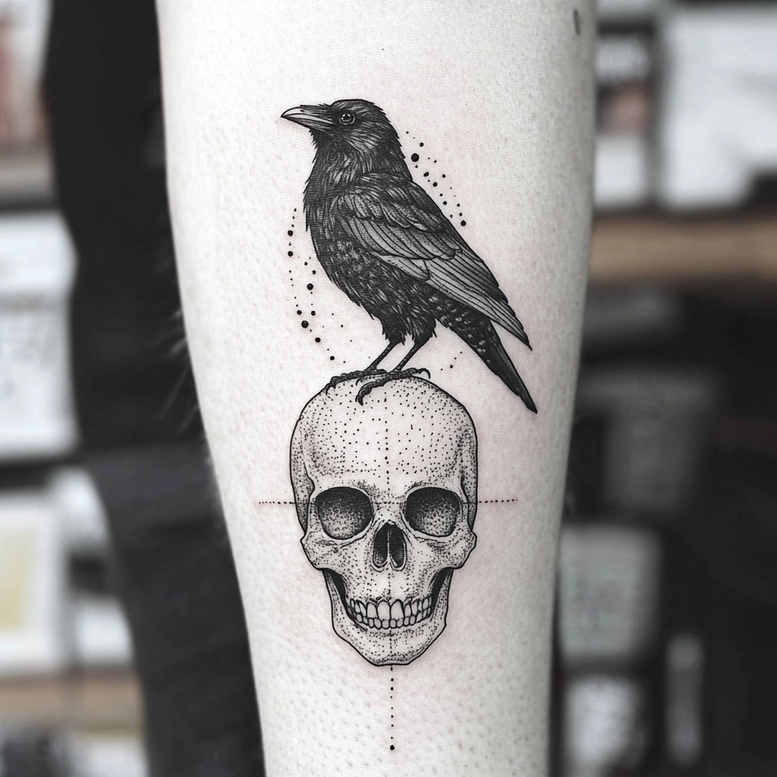 This AI-generated tattoo project presents a crow perched on a skull, rendered in meticulous black and grey dotwork. The composition hinges on a bold silhouette and a measured field of stippling that creates texture and depth without relying on smooth gradients. The crow’s feathers are defined with crisp lines and dense dot clusters, while the skull features fine line work that reveals the cheekbones, eye sockets, and dental structure, all balanced to maintain legibility on a forearm canvas. A vertical axis runs through the skull, complemented by a trail of evenly spaced dots that extends beyond the main forms, giving the piece a pattern-like rhythm that guides the eye along the length of the limb. This pattern-oriented backdrop is not merely decorative; it reinforces structure and unity across the design, a hallmark of dotwork technique. Symbolically, the raven often signifies transformation and intelligence, juxtaposed with mortality represented by the skull—together telling a narrative about resilience in the face of impermanence. From a technical standpoint, the ink density is carefully calibrated to achieve strong contrast while preserving subtleties in light skin tones, making this piece both bold and refined. The design lends itself to a smaller-to-medium scale on the forearm, with enough intricacy to reward close inspection yet clear lines for longevity. For clients exploring cover-up options, the dense dark forms provide a robust canvas to mask previous tattoos while preserving a striking focal point. As an AI-generated tattoo project, this concept demonstrates how algorithmic creativity translates into tattoo-ready ideas, inviting collaboration with an artist to tailor line weight, dot density, and spacing to individual anatomy and skin tone. The black and grey palette enhances versatility and timelessness, while the dotwork pattern adds texture and allure, aligning with trends in fine line and geometric-leaning body art. Overall, this tattoo design blends classical symbolism with contemporary dotwork aesthetics, appealing to enthusiasts of meaningful tattoos, small tattoos, and collectors seeking a dignified piece that remains legible over time.
