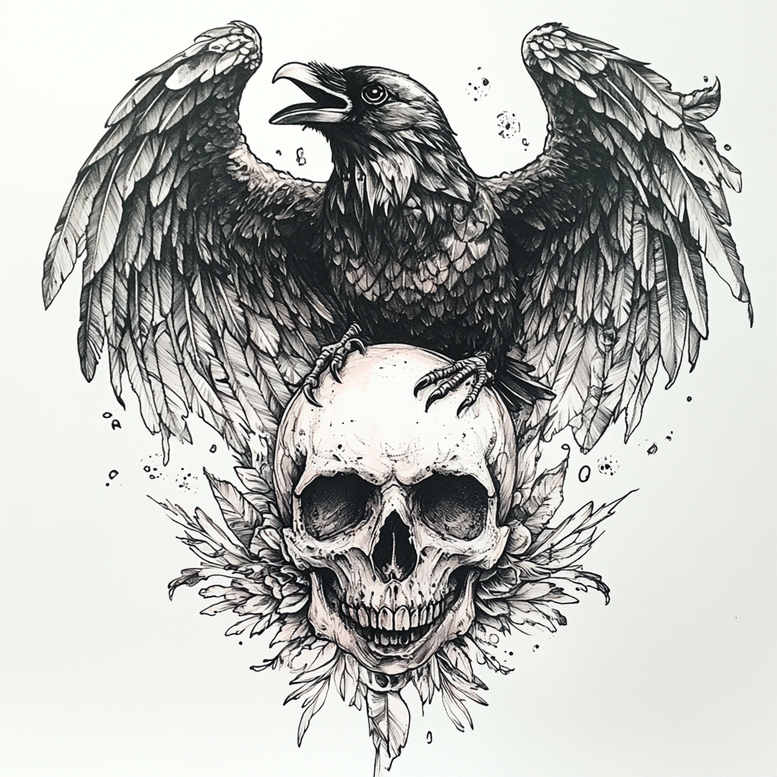 This tattoo design presents a stark black and grey composition featuring a raven perched atop a human skull, framed by laurel-like leaves and scattered ink splatters. The artwork relies on bold linework and meticulous shading to separate light and shadow, with the raven’s plumage rendered in dense feather detail that contrasts with the smooth bone of the skull. The leaves form an organic halo around the central motif, providing an natural negative space that enhances readability on skin and allows for variations in placement. Conceptually, the raven evokes mystery, intellect, and transformation, while the skull nods to mortality and the passage of time; together they create a timeless tattoo design that can carry personal meaning for many wearers. This is an AI-generated tattoo project concept, produced to explore a dramatic black and grey aesthetic with careful line precision and depth. The technique emphasizes crisp contours, subtle gradations of shade, and crosshatching that builds texture without color, making it suitable for both small tattoos and larger canvases. The contrast between the raven’s dark plumage and the skull’s stark bone establishes a strong silhouette that remains legible as it ages, an important consideration for a cover-up where older ink needs concealing while preserving a striking centerpiece. The leaves act as a natural frame, giving a sense of movement and organic flow that adapts well to forearm, chest, or back placements, while keeping the composition compact enough for a clean tattoo design. For clients seeking symbolism, the combination of life, death, and metamorphosis resonates across traditions, offering avenues for meaningful tattoos and a bold statement in black and grey ink. In terms of market appeal, this design aligns with contemporary trends in fine line tattoo and dark graphic realism, while remaining versatile for bespoke adjustments in size, spacing, and level of detail; it also demonstrates how a dark, high-contrast motif can successfully support a cover-up strategy for challenging prior work. As a gallery-ready tattoo design, it speaks to tattoo collectors seeking meaningful tattoos and a striking balance of realism and graphic impact; it’s a solid reference for fine line tattoo practice and black and grey ink in professional settings.