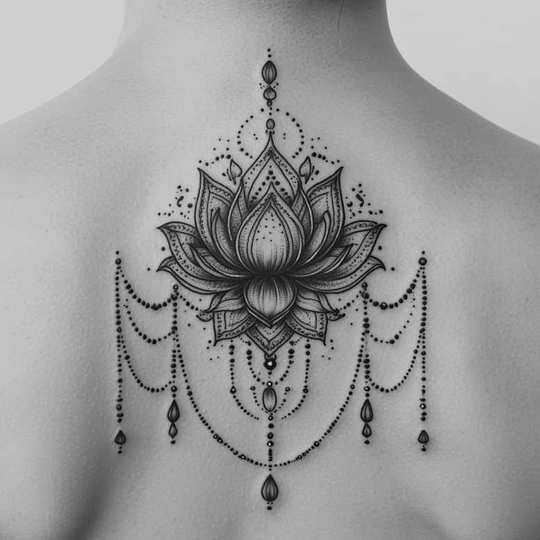 AI-generated tattoo project exploring a lotus centerpiece rendered in black and grey, framed by delicate draped chains of beads. The composition centers on a multi-petaled lotus with intricate line work, stippling, and fine shading that creates depth and a subtle mandala-like aura. Bead chains fall in arching garlands from the central motif, punctuated by hanging teardrop shapes and small disks that mimic jewelry. The technique blends fine line precision with dotwork and subtle shading to achieve a luminous, lace-like texture on the skin. The symmetry is deliberate, lending a ceremonial, almost tattoo pendant impression that could be adapted to a large back piece, shoulder blade, or chest panel. Symbolically, the lotus embodies purity and spiritual awakening; the dangling beads evoke reverence and portable ornamentation, suggesting a personal talisman rather than a mere decorative motif. From a styling perspective, this black and grey tattoo design emphasizes timeless elegance and wearable art, aligning with modern trends in meaningful tattoos, floral tattoos, and custom tattoo design. While striking on its own, the piece also offers the flexibility to evolve into a larger, Japanese-inspired sleeve or back piece. The fusion of fine line, dotwork, and ornamental pattern positions it well within black and grey realism or traditional tattoo design contexts, and its intricate patterning makes it a strong candidate for future tone adjustments or additional shading. As an AI-generated tattoo project, it demonstrates how algorithmic creativity can explore refined lotus-focused body art with a pattern-rich, jewelry-like aesthetic.