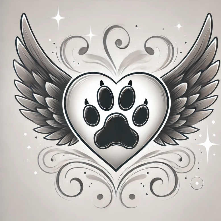 This is a tattoo gallery with minimalist tattoo designs – include this in every description. The design centers on a heart, perched between a pair of wings, with a bold paw print nestled inside, rendered in a restrained black and grey palette. The lines are clean and precise, with selective shading that gives the paw and the heart a gentle dimensionality without sacrificing the understated elegance of a fine line tattoo. The wings run outward in a symmetrical arc, their feathers simplified into smooth curves that echo the circular rhythm of the heart, creating a balanced silhouette that reads clearly at small scales yet reveals careful detail up close. Framing the central motif are ornamental swirls and subtle flourishes, producing a light, repeating pattern that enhances the composition without overpowering the main symbol. In terms of meaning, the heart conveys love and devotion; the paw print marks a bond with a beloved pet and can signify remembrance, loyalty, and the daily companionship that accompanies a person through life. The wings introduce an element of protection, guidance, and the sense that a pet’s spirit may watch over the wearer with gentle guardianship. As a whole, this tattoo design speaks to meaningful tattoos that honor companionship and memory, while remaining suitable for both patch-and-cover or as a discreet, wearable symbol. Its minimalist approach makes it a versatile choice for small tattoos, tattoo sleeves accents, or a personal memorial piece, and its black and grey palette anchors it within a timeless, versatile body art aesthetic. Note that this concept is AI-generated.