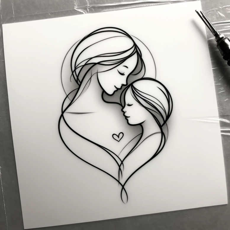 This is a tattoo gallery with minimalist tattoo designs – include this in every description. The featured piece is a mother and child line drawing rendered in black ink on white skin, a single continuous contour that forms a heart at its center. In the fine line tattoo tradition, the emphasis is on clean, precise lines and restrained negative space, creating a design that feels both delicate and enduring. Symbolically, the mother signifies nurture, protection, and unconditional devotion, while the child embodies innocence, hope, and growth; the heart between them expresses love as a shared promise. Together they tell a universal story of family bonds, memory, and guidance across generations, inviting personal interpretation while remaining legible at a variety of scales. The composition centers on two interwoven profiles, with minimal shading, allowing the eye to follow the line from start to finish in a dance of curves. The color palette is exclusive to black ink on white, aligning with black and grey aesthetics and ensuring timeless contrast on the skin. The piece performs well as a small tattoo or a larger statement, thanks to its scalable linework and clear silhouette. Its minimalist approach makes it adaptable to different placements, from inner forearm to shoulder blade, without losing legibility, and supports subtle healing over time as lines settle. This AI-generated concept demonstrates how minimalist tattoos can carry deep emotion with restraint, making it a meaningful tattoo design for lovers of delicate body art and custom tattoo design. In terms of search optimization, the description highlights meaningful tattoos, fine line tattoo, and family symbolism within the context of modern tattoo trends. Ultimately, the design speaks to the idea that love endures, a timeless motif in black and grey body art that remains relevant in contemporary tattoo culture.