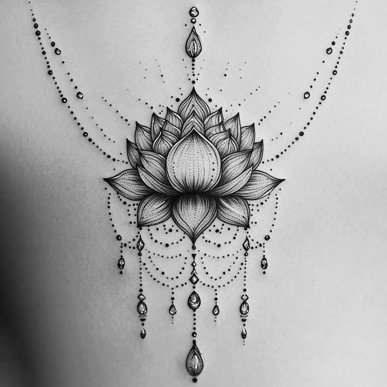 This is an AI-generated tattoo project illustrating a centered lotus blossom framed by ornamental bead chains and teardrop gems. The design relies on precise fine-line technique and black and grey shading, with careful linework forming the lotus petals and subtle gradient achieved through stippling and feathered shading. The bloom sits at the center, its multiple layered petals treated with crisp edges and soft tonal transitions to preserve clarity as ink settles. From the core, arcing strings of beads and jewel-like droplets descend in symmetrical arcs, creating a chandelier-inspired silhouette that reads as movement and balance on the skin. The overall composition embraces graphic patterning, with repeating dot-work elements, delicate links, and teardrop shapes that emphasize rhythm and harmony. The result is a tattoo design that feels both timeless and modern, suitable for a ribcage, chest, back, or shoulder placement where a vertical, statement piece is desired. The lotus carries symbolism of purity, spiritual awakening, and resilience, while the dangling motifs evoke grace and personal meaning; clients often choose lotus tattoos to mark growth, endurance, or a new chapter. For artists and clients seeking a meaningful tattoo, this piece demonstrates how fine-line linework can carry complex ornamentation without sacrificing readability over time. As an AI-generated concept, it showcases algorithmic precision and a contemporary approach to coming-of-age body art, and could serve as a strong foundation for a custom tattoo design project. In terms of craft, expect clean line fidelity, stable black ink density, and coherent negative space that respects skin texture. This design leverages black and grey ink, but may be adapted to color if desired, expanding into a full-color version or a muted monochrome palette. The piece aligns with trends in Japanese-inspired and floral tattoo motifs, while remaining accessible to those seeking small-to-medium tattoos that express meaningful tattoos and personal symbolism. Keywords to consider include tattoo, tattoo design, meaningful tattoos, fine line tattoo, lotus flower tattoo, infinity tattoo, tribal tattoo, rose tattoo design, small tattoos, flower tattoos, custom tattoo design, Japanese style tattoo, black and grey, realistic tattoo, body art, ink. Note: AI origin is acknowledged for this conceptual tattoo project.