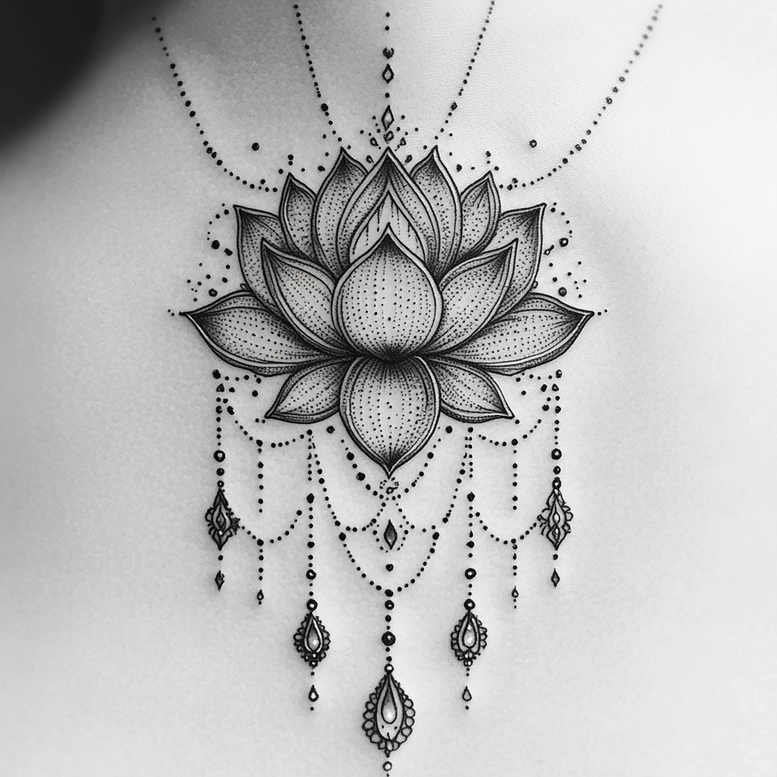 AI-generated tattoo project concept featuring a lotus flower at the center, rendered in black and grey with meticulous dotwork shading and hanging bead chains. The lotus petals spread in a symmetrical, mandala-inspired arrangement, each petal edged with fine lines and stippled shading to create depth and texture. Drifting from the bloom are curved strands of beads and small pendants, forming a delicate cascade that adds movement and a jewelry-like aesthetic to the composition. This design blends traditional line work with ornamental pattern elements, suitable for a larger back piece, chest, thigh, or sleeve, yet adaptable to smaller canvases as a refined tattoo design. The central lotus symbolizes purity, spiritual growth, and renewal, while the beadwork suggests continuity and connection, allowing the motif to function as a meaningful tattoo in both personal and cultural contexts. The piece relies on clean black ink with precise line weight variation and dot shading to achieve subtle gradations rather than solid fills, placing it firmly in the fine line tattoo and black and grey categories. Its pattern-driven structure makes it a strong candidate for cover-up if placed strategically, depending on scale and location, and it can be paired with additional elements such as infinity symbols or floral companions if desired. As a custom tattoo design concept, it demonstrates how pattern, texture, and negative space can coexist to create a timeless body art statement. This AI-generated tattoo project concept is designed to serve as a meaningful tattoo design for clients seeking detailed, small-to-medium scale flower tattoos, with wide applicability for future ink sessions and touch-ups across various body locations.