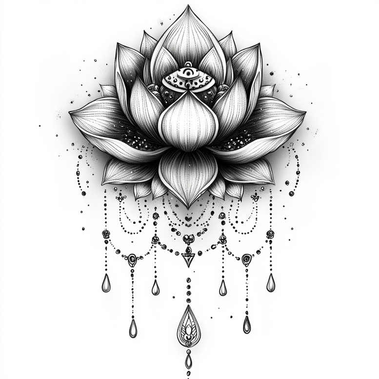 AI-generated tattoo project, this lotus bloom with jewel chains combines botanical symmetry with jewelry-inspired ornamentation in precise black-and-grey linework. The central lotus is rendered with multiple layered petals, each petal defined by fine lines and subtle gradient shading that creates a sense of depth while maintaining crisp readability on skin. Beneath the bloom, delicate strands of beads and chains drop in a symmetrical arc, punctuated by teardrop charms and a central pendant that anchors the composition. The repeated beads and pendants form a pattern-like fringe, giving the design a decorative, chandelier-inspired rhythm that can be scaled for different body areas. The piece balances botanical symbolism—rebirth, purity, spiritual growth—with ornamental jewelry aesthetics, where the beadwork implies movement and light. The artist’s approach relies on fine line technique, stippling for texture, and controlled grayscale shading to ensure legibility at both small and large scales. For tattoo enthusiasts seeking a meaningful tattoo design with elegant linework, this lotus motif offers versatility: it works as a standalone small piece or extended into a larger sleeve or back piece, and it can be adapted to a cover-up if needed due to its high contrast and strong negative space around the petals. The concept also serves as a robust pattern reference, thanks to its repeating motifs and symmetrical balance, and remains faithful to black-and-grey ink principles while offering potential for additional shading and embellishment by a professional artist. This is an AI-origin tattoo concept intended as inspiration for a custom design, preserving the feel of a refined fine-line tattoo while inviting personal tweaks by the tattoo artist.