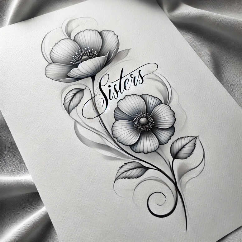 This piece is part of a tattoo gallery with minimalist tattoo designs and showcases black and grey fine-line technique that delicately renders two blossoms intertwined with a flowing script reading Sisters. The composition relies on slender line work, restrained shading, and ample negative space to create an airy, readable silhouette suitable for small to medium placements. The two blooms, with soft, rounded petals and curling stems, sit in a vertical arrangement that invites a graceful arc along the forearm or ribcage, while a meandering line of leaves anchors the design and provides a natural counterbalance to the script. The repeating pattern of petal shapes forms a subtle rhythm across the piece, emphasizing harmony and continuity—an attribute of many floral tattoo designs. In terms of symbolism, the flowers stand for growth, renewal, and resilience, while the word Sisters adds a deeply personal layer—signifying sisterhood, loyalty, shared memories, and mutual support. The tattoo design thus blends botanical imagery with meaningful typography to tell a story of connection and endurance. The black and grey palette reinforces a timeless aesthetic and ensures legibility as the piece ages, and the fine-line approach allows for a refined look that remains elegant when scaled down for small tattoos. Conceptually, this is a project idea and a perfect example of how minimalist line work can convey meaningful tattoos without overwhelming detail. As AI-generated concept art, it demonstrates how a simple botanical motif can become a powerful personal statement, inviting the wearer to reflect on family bonds while enjoying the visual poetry of tiny, repeatable patterns in ink. For potential clients, the design promises a versatile, custom tattoo design that primes future updates or extensions, preserving coherence with additional florals or script if desired, and stands as ink-ready portfolio piece.
