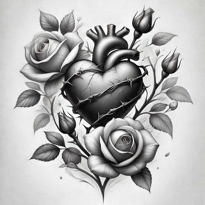 This AI-generated tattoo project concept centers on a monochrome composition where a anatomically rendered heart sits at the core, encircled by a coil of barbed wire, with two blooming roses and a network of leaves and stems providing an organic frame. The design uses high-contrast shading to push the heart forward while the barbed wire offers a sharp, protective boundary. Roses symbolize love and renewal; the barbs echo pain, resilience, and the complexity of emotional experience. Rendered in black and grey ink, the piece achieves a dramatic, timeless look suitable for clients seeking a meaningful tattoo with a cinematic mood. The composition remains dense yet balanced, ensuring clear silhouette fidelity when translated to skin. The central heart anchors the artwork, the barbed wire wraps around it to suggest confinement or struggle, while the surrounding roses soften the narrative and provide natural counterpoints. Leaves and stems extend outward as a natural frame, guiding the eye through the design from bottom to top. Technically, the work relies on smooth gradient shading, crisp line work for the heart outline and barbs, and careful black-to-gray transitions to maintain legibility at smaller sizes. It nods to realism and traditional motifs within a contemporary grayscale treatment, marrying a classic symbol with an edgy twist. In terms of meaning, the juxtaposition of life-affirming roses with a guarded heart and protective wire speaks to endurance and the beauty that persists through hardship. As an AI-generated tattoo project, it illustrates how digital design can inspire custom tattoo ideas that translate into fine line tattoo and bold grayscale styles. Keywords include tattoo, tattoo design, meaningful tattoos, fine line tattoo, lotus flower tattoo, infinity tattoo, tribal tattoo, rose tattoo design, small tattoos, flower tattoos, custom tattoo design, Japanese style tattoo, black and grey, realistic tattoo, body art, ink.