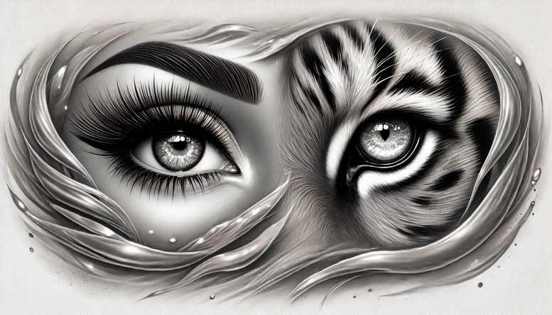 AI-generated tattoo project features a bold black and grey split-eye design where one side renders a realistic eye with lashes and eyebrow, and the other dissolves into tiger stripes and geometric patterning that sweep toward the temple. The seamless transition between portrait detail and graphic motif is achieved with layered black ink, soft gray shading, and precise line work, producing depth, motion, and contrast. The gaze anchors the composition, while the animal stripes infuse energy and symbolism—ferocity, protection, and focus—without overwhelming the central eye. Surrounding curves and negative space act as a delicate frame that guides the eye along the brow, cheek, and hairline, enhancing realism while allowing the pattern to breathe. This tattoo design leans toward black and grey realism with fine-line precision, yet embraces graphic pattern to create a distinctive silhouette. In terms of meaning, it speaks to the fusion of human intent and wild vitality, a common theme in meaningful tattoos and Japanese-style ink influences. The tiger stripes offer a bold statement within a larger piece and are balanced by the calm, introspective eye. Techniques emphasize meticulous shading, crisp contouring, and durable ink distribution to maintain longevity. Because of its deep shadows and dense pattern, the design is well-suited for cover-up work, enabling effective concealment of older tattoos beneath. The concept is highly customizable—pattern density, transition, and the eye’s expression can be adjusted to tell a personal story, a hallmark of a bespoke tattoo design. While the image is AI-generated, a skilled tattoo artist can translate it into a wearable, long-lasting piece that honors form, function, and meaning in black and grey ink. This composition thus offers a dramatic yet refined body art option for collectors of fine-line, realistic, and graphic tattoos, with strong potential as a centerpiece or a seamless extension of existing work.
