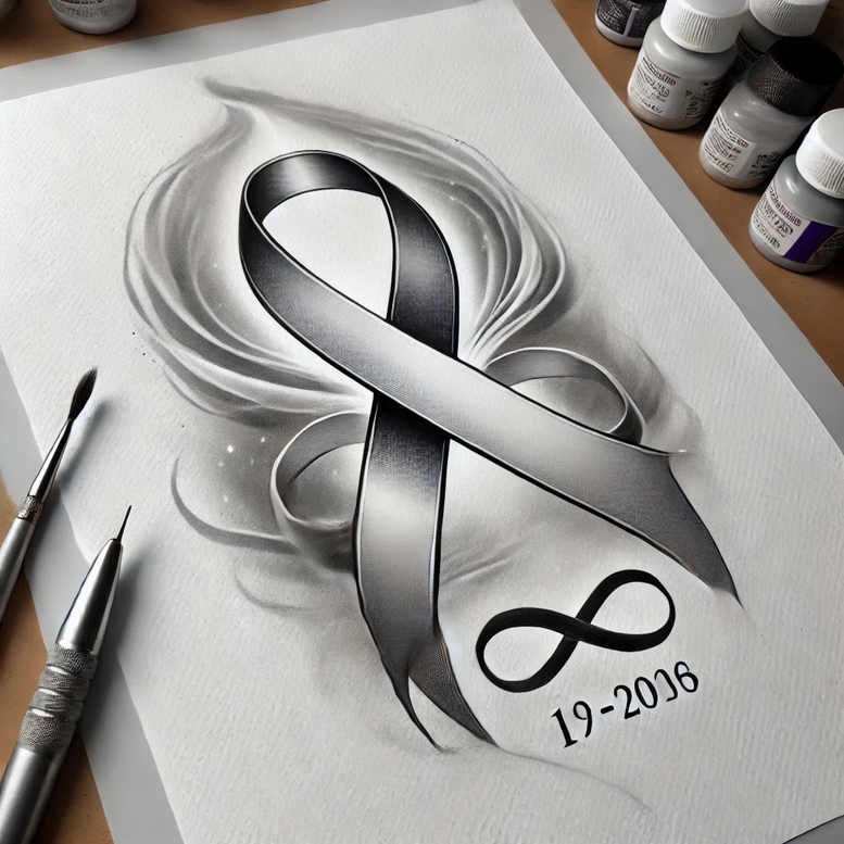 This is a tattoo gallery with minimalist tattoo designs. The featured concept presents a black ribbon curling into an infinity loop, executed in black and grey with a crisp line and gentle shading on a pale surface. The composition favors a single continuous stroke, where the ribbon’s steady curve flows into itself, creating a meditative silhouette that reads immediately as a memorial symbol. Without elaborate ornament, the design relies on negative space and precise linework to deliver clarity at small scales, a hallmark of fine line tattoo style. The memorial intent is suggested by the ribbon—a common symbol of remembrance—coupled with an understated dating or initials that a client may personalize. In a broader sense, the infinity motif embodies eternally linked memories, enduring love, and healing after loss, making this piece suitable for meaningful tattoos that honor someone special. The result is a versatile, timeless image that translates well across body placements such as the wrist, forearm, or behind the ear, offering longevity in wear and ease of touch-ups. The black and grey palette enhances contrast, ensures longevity, and harmonizes with other tattoos, while the minimalist approach keeps the piece approachable for first-timers. This concept fits neatly into a custom tattoo design workflow: it can be expanded with delicate line detailing or kept spare for a subtle act of remembrance. In a broader aesthetic sense, the design resonates with modern tattoo trends toward small, refined symbols that carry a personal narrative, rather than overt pictorial storytelling. AI-generated concept aside, the memorial infinity ribbon stands as an elegant testament to memory, resilience, and hope, embodying meaningful tattoos and the appeal of small tattoos in black and grey ink.