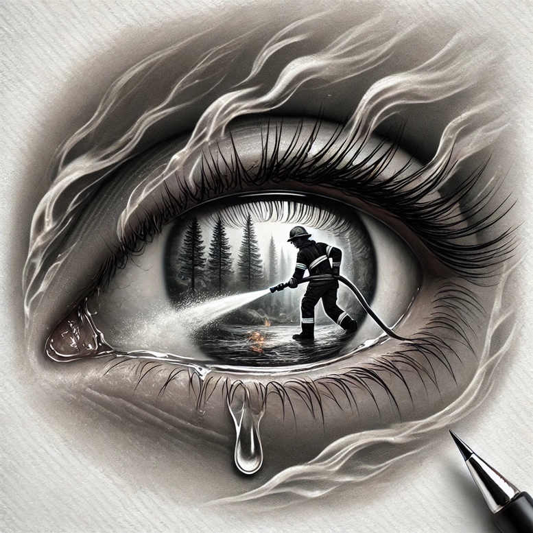 This is an AI-generated tattoo project concept that presents a dramatic black-and-grey composition built around a close-up of an eye. Within the iris, a miniature, hyper-detailed scene unfolds: a firefighter in silhouette strides through a damp forest clearing, directing a jet of water from a hose onto a small flame flicker beside a reflective pool. The surrounding elements—the dark pines, the glint of water, the curling smoke, and the subtle highlights along the eyelid—are rendered with restrained shading to preserve realism while preserving a dreamlike, almost surreal aura typical of AI art. The eye functions as a frame and portal, its concentric iris rings guiding the viewer’s gaze toward the micro-scene, while a single teardrop gathers along the lower lid, echoing themes of endurance, cleansing, and vigilance. The technique blends fine line detailing in the lashes and forest textures with broad, soft gradients to convey depth and atmosphere, favoring black and grey ink aesthetics that suit realistic tattoo styles. The firefighter’s hose line is crisp and precise, creating a stark contrast with the diffuse smoke and the rippled water surface, inviting reflection on how elements such as fire and water interact as catalysts for transformation. Symbolically, the image speaks to resilience and protection: the eye bears witness to danger yet acts, symbolizing personal renewal through courage and action. As an AI-generated tattoo project concept, the design is particularly suitable for cover-ups, where heavy shading can obscure older work while preserving a meaningful narrative that can be expanded or scaled. The composition nods to traditional and contemporary tattoo sensibilities—strong tonal contrast, clear subject isolation, and a cohesive backdrop—making it adaptable for various placements, from a compact forearm piece to a larger back or chest panel. Integrated keywords for discoverability include tattoo, tattoo design, meaningful tattoos, fine line tattoo, lotus flower tattoo, infinity tattoo, tribal tattoo, rose tattoo design, small tattoos, flower tattoos, custom tattoo design, Japanese style tattoo, black and grey, realistic tattoo, body art, and ink, ensuring this concept appeals to readers and clients seeking a cinematic, story-driven body art concept.