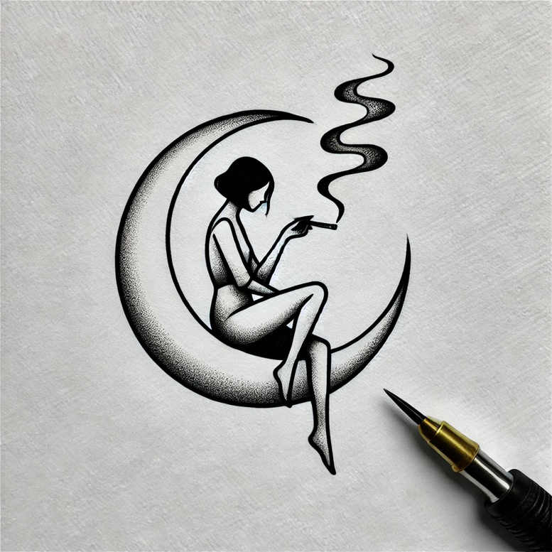 This is a tattoo gallery with minimalist tattoo designs and this piece presents a black and grey minimalist line drawing of a woman perched on a crescent moon, with wisps of smoke rising above. Rendered in a clean fine-line technique, the composition relies on precise contour work, generous negative space, and restrained shading to convey quiet introspection. The moon’s curve cradles the figure, creating a compact vertical balance that reads well as a small tattoo while remaining expressive. The surrounding smoke adds a subtle breath of impermanence, inviting viewers to reflect on thoughts that drift and fade. In terms of meaning, the crescent moon has long symbolized cycles, transformation, feminine energy, and intuition, while the solitary woman embodies contemplation, patience, and personal harmony. Together they form a narrative of inner growth and dreamlike focus, making this design well suited for meaningful tattoos and as a sophisticated fine line tattoo concept. The black and grey palette reinforces the understated mood and ensures legibility across skin tones, with slender lines that stay crisp over time. This AI-generated concept demonstrates how digital ideation can inform traditional tattoo design, blending modern minimalism with timeless symbolism to create a versatile piece for body art enthusiasts. As a project idea, it invites customization—altering placement, scale, or line weight—while preserving the core motifs of moon, woman, and smoke. In sum, this design speaks to quiet strength, nocturnal elegance, and the beauty of restraint in meaningful tattoos, making it a refined choice for a refined small tattoo or sleeve integration.