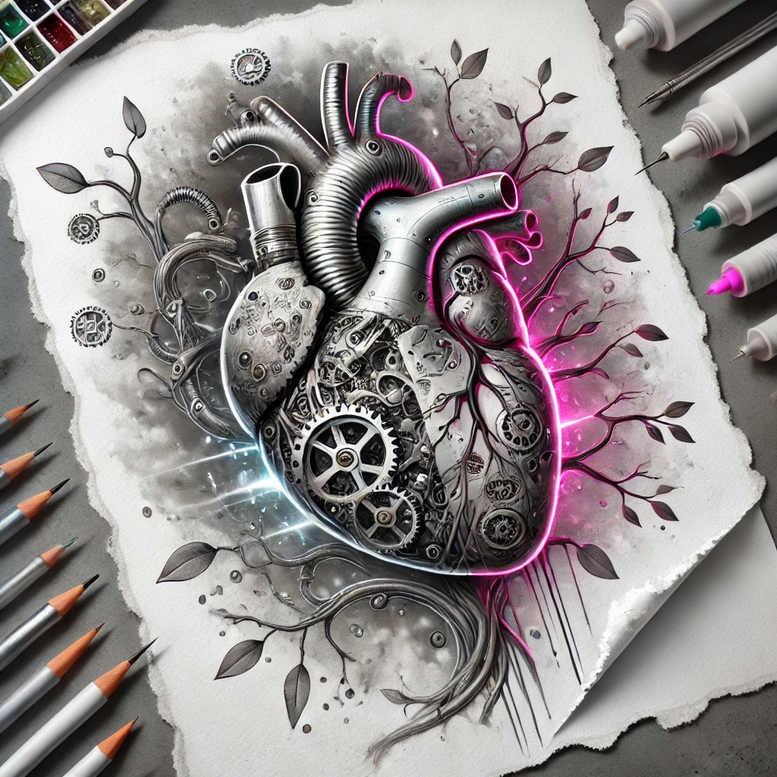 This AI-generated tattoo project presents a hyper-detailed mechanical heart rendered with chrome plating, gears, pistons, and tubing, entwined with gnarled branches and sparse leaves. Neon pink and electric blue glows trace the heart’s outer rims, contrasting with the grayscale machinery that reveals intricate line work and negative space. The composition sits on a torn-paper background suggesting the design is ready for ink on skin, with the surrounding tools—pencils and markers—hinting at the tattoo studio workflow. The piece blends biomechanical imagery with natural motifs, echoing themes of life, time, and renewal. The heart’s exposed gears symbolize the inner engine driving life, while the branching vines evoke growth and resilience. The neon accents imply energy and vitality, used sparingly to highlight key contours and mechanical details. The image demonstrates a high-contrast approach that would translate well to tattoo design, particularly in black and grey or full color. As a cover-up-ready concept, the dark tonal base and complex patterning can obscure an earlier tattoo while preserving meaningful symbolism. The artwork leans toward a modern, realistic tattoo aesthetic with a touch of steampunk influence; the fine line detailing and precise gear motifs would translate well into small or large-scale pieces. This is an AI-generated tattoo project, showcasing how digital illustration can guide traditional ink. For the final tattoo design, consider using a Japanese-influenced composition and the contrast between hard metal lines and organic branches, creating a statement piece that works as a bigger tattoo or a dramatic sleeve. The design also nods to variations like rose tattoo design or infinity tattoo concepts, offering multiple avenues for meaning in tattoo art. Technique-wise, the piece employs layered grayscale shading with crisp mechanical outlines to preserve readability on skin, while the neon accents provide an eye-catching focal point. The botanical elements give the composition movement and balance, enabling a versatile canvas suitable for chest, shoulder, or forearm placements. This tattoo design invites customization, adjusting line weight, scale, and color saturation to fit personal stories, while maintaining a bold, graphic impact that remains legible up close and from a distance.