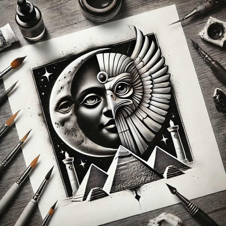 Presented here is an AI-generated tattoo project concept, rendered in black and grey to emphasize volume and contrast. The composition centers on a Moon and Sun duality, where the left hemisphere hosts a cratered lunar face and the right side morphs into a segmented sun with feathered, geometric rays. The celestial pair sit above a jagged strip of pyramids, their silhouettes drawing the eye toward a horizon that anchors the piece. Flanking the scene are slender towers and a scatter of stars, which add a sense of depth and a mythic skyline. The grayscale shading is built with smooth gradient transitions, crisp contour lines, and subtle stippling to evoke texture on stone, metal, and sky. The sun’s rays and the mountains below form a dynamic rhythm, creating a pattern-like cadence across the design that is both bold and refined. Symbolically, the duality speaks to balance—night and day, mystery and order—while the pyramids reference ancient civilizations, suggesting endurance and memory. The towers act as sentinels watching over the celestial dialogue, and the star field implies infinity and aspiration. Although presented as a concept, the piece translates well into a custom tattoo design, adaptable to small placements or expansive canvases; it can be rendered with fine line precision for a delicate look or expanded with deeper black work for a strong, stand-alone statement. As an AI-generated tattoo project, this concept demonstrates how algorithmic creativity can yield meaningful tattoos that suit modern body art tastes, while its dark tonal weight makes it especially suitable for a cover-up, allowing problematic marks to be concealed under a cohesive narrative of day and night—patterned rays weaving across the sky. It embraces keywords relevant to tattoo enthusiasts, including tattoo, tattoo design, meaningful tattoos, fine line tattoo, lotus flower tattoo, infinity tattoo, tribal tattoo, rose tattoo design, small tattoos, flower tattoos, custom tattoo design, Japanese style tattoo, black and grey, realistic tattoo, body art, ink.