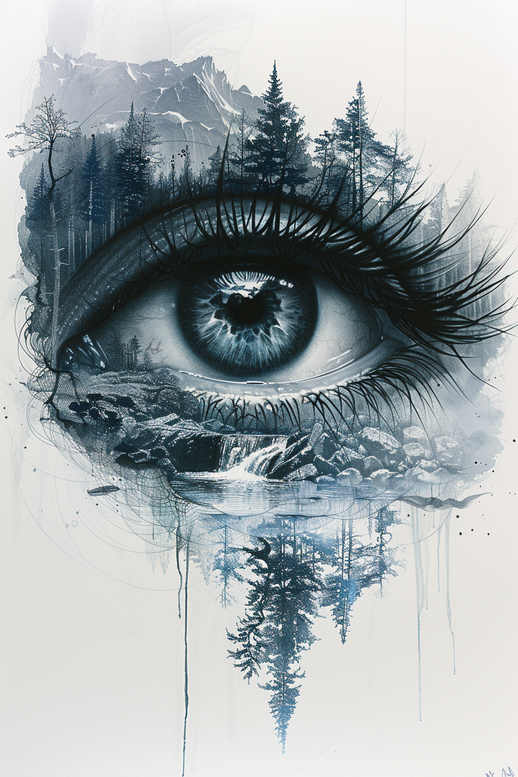 An AI-generated tattoo project, this concept presents a single eye whose iris dissolves into a landscape of pine trees, a jagged mountain range, and a winding river, all rendered in black and grey with fine line precision. The artist’s approach blends micro-detailing of eyelid contour with broader terrain shading, producing a composition that reads as photographic realism at close inspection while remaining tattoo-friendly in scale and ink distribution. Trees rise along the upper eyelid and fade into the lashes, mountains anchor the crown with crisp edge-work, and the river threads through rocky flats beneath the pupil, creating a continuous flow that guides the eye around the design. Subtle stippling and feathering generate texture for bark, water, and distant peaks, while deliberate contrast ensures legibility upon aging. The blue-grey monochrome palette unifies the piece, offering a sophisticated take on black and grey tattooing that suits forearms, shoulders, or chest panels and translates well across skin tones. Symbolically, the eye acts as a window into inner landscapes, suggesting introspection, memory, and the way perception shapes experience; the forest and mountains convey resilience, exploration, and a connection to nature, while the water symbolizes renewal. Because this is an AI-generated tattoo project, it demonstrates how digital previews can inform a custom tattoo design that is both highly detailed and adaptable to client anatomy. For those seeking meaningful tattoos or small-to-medium body art with a strong narrative, this concept provides a compelling option: a cover-up-friendly piece that can conceal prior markings while preserving a dramatic, cohesive image. The pattern in the landscape—interlacing trees, peaks, and flowing water—adds a graphic texture, demanding precise linework and careful planning to ensure longevity. From a publication or portfolio perspective, the piece showcases contemporary tattoo design through realism-infused illustration, aligning with keywords like tattoo, tattoo design, meaningful tattoos, fine line tattoo, lotus flower tattoo, infinity tattoo, tribal tattoo, rose tattoo design, small tattoos, flower tattoos, custom tattoo design, Japanese style tattoo, black and grey, realistic tattoo, body art, ink.