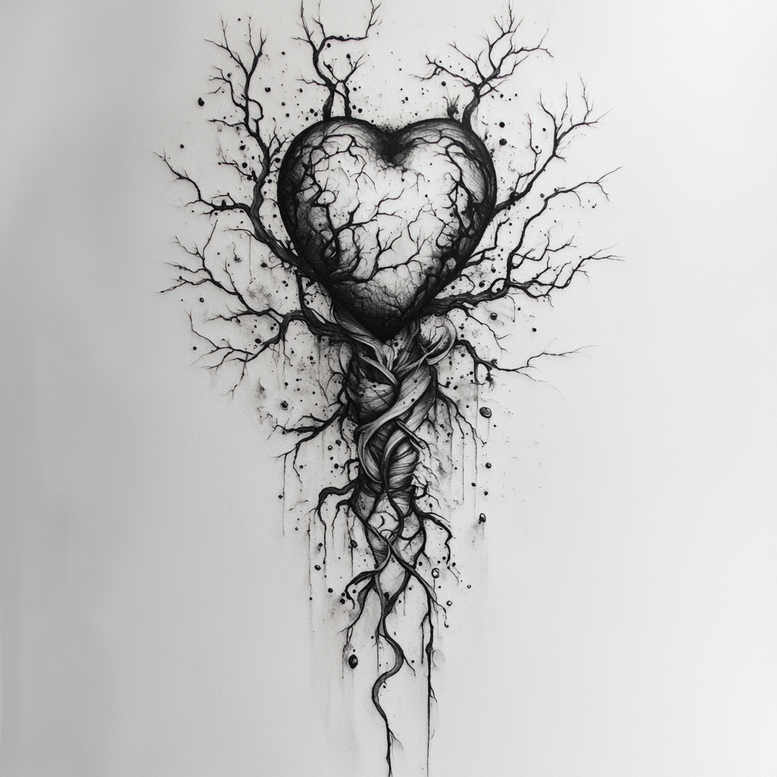 This AI-generated tattoo project presents a dark, contemplative motif: a heart formed from intertwining branches and trailing roots, rendered in a precise fine line style. The central heart is composed of negative space and dense shading, with slender branches radiating outward like veins, giving the piece a sense of growth and resilience. The roots twist downward in a stylized, rope-like braid, creating a vertical composition that flows with the body’s contours. The design relies on black and grey ink, with subtle gradations and crisp linework that translate well on the forearm, chest, ribs, or back. The pattern-like quality emerges from the repeated branching motifs and the systematic fade toward the edges, producing a graphic tattoo design that reads both delicate and striking. As a single motif built from natural elements, it carries symbolism of growth, interconnectedness, and endurance: the heart as a source of life, branches as choices and paths, roots as grounding. This piece suits meaningful tattoos for someone seeking a larger statement without color, and its fine line approach makes it adaptable for small tattoos when scaled or extended into a sleeve. For those exploring Japanese style tattoo influences, black and grey realism vibes are evident through shading depth and controlled contrast, while the overall composition remains accessible for incorporation into custom tattoo design projects. Because of its dark shading and dense lines, it is especially suitable as a cover-up, helping to conceal older ink beneath. It can be paired with other elements for a customized tattoo design, such as a lotus flower tattoo or infinity tattoo motif to symbolize growth and continuity. The pattern-rich linework lends itself to adaptions in tribal or realistic black and grey styles, making this design a versatile foundation for a stand-alone piece or a larger body of work.