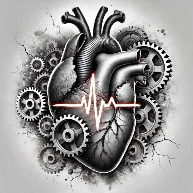 This is an AI-generated tattoo project concept that fuses anatomical realism with mechanical precision. At the center lies a lifelike heart rendered in black and grey, its surfaces shaded to reveal depth, moisture, and a tactile sense of weight. Surrounding the organ are interlocking gears of varying sizes, their edges crisp and metallic, forming a dynamic ring that suggests motion and power. Cracks traverse the heart’s surface, conveying resilience through fracture, while tubular arteries weave outward, linking organic form to the surrounding machinery. An electric orange heartbeat line cuts horizontally across the heart, providing a bold color contrast that instantly draws the eye and reinforces vitality within a steampunk framework. The composition sits firmly in the realm of realistic tattoo design with a distinct mechanical flair, utilizing precise linework, soft gradations, stippling, and strategic highlights to evoke metal textures and organic tissue. The circular gear arrangement creates a repeating motif that translates well into larger canvases such as sleeves or back pieces, and it also supports cover-up applications by lending dark shading that can mask underlying ink while maintaining a strong narrative. As an AI-generated tattoo project, this concept demonstrates contemporary approaches to concept art for custom tattoo design, offering scalable details for chest or ribcage placement with adaptability to size and shading preferences. Symbolically, the piece pairs life with industry: the heart embodies life force; gears symbolize progress and persistence; cracks reflect endurance amidst adversity; and the orange pulse line emphasizes vitality and rhythm. This concept highlights its AI origin and potential as a cover-up-ready, pattern-rich tattoo project.