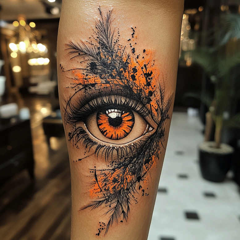 AI-generated tattoo project offers a near-photoreal eye anchored by a vivid orange iris and surrounded by an expressive black-and-grey ink pattern. The central eye is rendered with meticulous gradient shading to convey depth in the sclera and spherical cornea, while the iris radiates with bright orange segments and a deep black pupil, with sparse white highlights to suggest moisture and life. Fine-line work defines the lashes and eyelid contours, and the eyelid crease is softened with subtle gray shading to preserve realism without digital look. Around the eye, a kinetic splash of ink forms an abstract pattern: delicate, branching lines weave with splatter shapes to radiate outward, creating a dynamic boundary that reads as both art and energy. The color accent is deliberate: orange iris against black ink constitutes a strong focal point, while the rest remains primarily black and grey to ensure longevity on skin. The surrounding strokes resemble fractal branches or botanical twigs, giving the impression of growth and movement without crowding the eye’s central motif. Symbolically, eyes are windows to perception, insight, and protection, and the orange hue deems warmth, courage, and vitality; together they communicate a meaningful tattoo design about inner fire and vision. The piece works well as a forearm or calf piece where a single, bold eye can anchor a sleeve or stand alone as a statement. Technique-wise, the blend of fine-line contouring, subtle shading, and controlled pigment density demonstrates a high level of craftsmanship suitable for both beginners seeking a striking first piece and experienced collectors chasing a contemporary twist on classic motifs. The piece also exemplifies how black-and-grey studies can be elevated with selective color to create a tattoo that remains legible with time, thanks to crisp line work and defined negative space. As an AI-generated tattoo project, it illustrates how digital ideation can inform traditional tattoo design, offering a fresh approach while preserving the artisanal feel of ink on skin. For search visibility, the design sits at the intersection of tattoo design, meaningful tattoos, fine line tattoo, and black-and-grey realism, with possible associations to Japanese-style tattoos and modern graphic patterns, and it can inspire future commissions as a unique custom tattoo design.