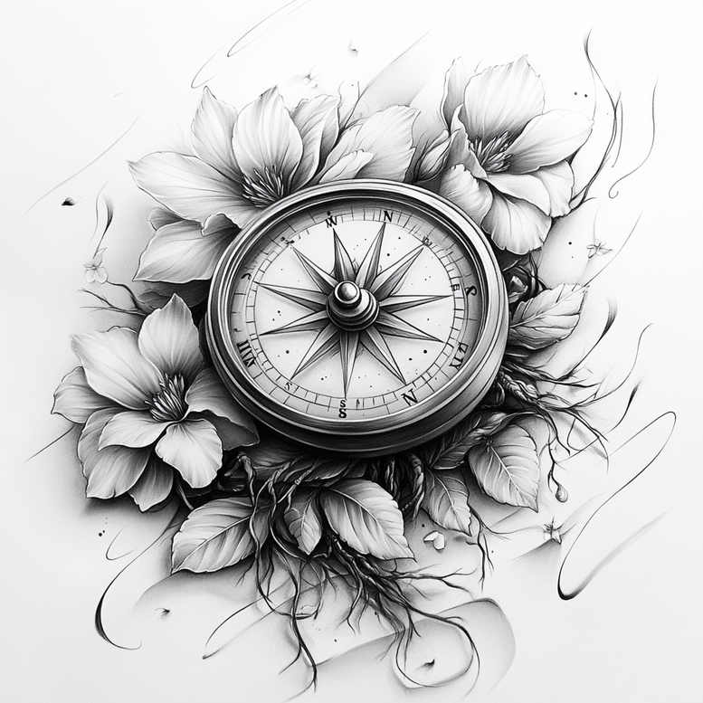 This AI-generated tattoo concept presents a refined, black and grey composition that marries a compass rose with hibiscus blooms, arranged in a natural, almost botanical halo. The compass sits at the center as a precise, eight-point star, its needle steady, the circular bezel marked with cardinal points and a subtle bevel that lends a tactile feel of vintage navigational instruments. Surrounding the compass, hibiscus blossoms unfold with delicate shading, each petal rendered in soft gradients to convey texture and depth, while slender stems and roots thread through the composition, anchoring the design to the skin like a living map. The interplay of hard linework and gentle gradients embodies a fine line tattoo aesthetic: crisp outlines define the core geometry of the compass while the petals, leaves, and roots are built with layered graphite tones that melt into smooth transitions. The overall balance is symmetrical yet organic, allowing this piece to read as both a travel-inspired symbol and a floral tribute, ideal for someone seeking a meaningful tattoo design that remains versatile for placement on the arm, shoulder, or back. In terms of technique, the artist leverages precision linework for the compass and a stippled or feathered shading approach to render the hibiscus and foliage, achieving a black and grey look with a luminous, almost charcoal-like quality. The symbolism is rich: the compass stands for direction, guidance, and exploration; the hibiscus embodies beauty, delicate strength, and temporary, fleeting moments, while the surrounding leaves and roots hint at growth, grounding, and a journey that continues beyond the skin. For those considering a larger piece or a lighter, smaller tattoo, this design scales well, preserving legibility of the compass while letting the botanical elements breathe around it. It also serves as a fine example of a custom tattoo design that blends natural motifs with navigational symbolism, suitable for fans of Japanese-inspired linework or Western botanical illustration alike, and it demonstrates how a black and grey palette can deliver both realism and elegance in a compact or extended canvas, making it a meaningful addition to a collection of small tattoos, floral tattoos, or a larger sleeve concept; AI-generated tattoo projects like this illustrate the evolving intersection of technology and traditional body art, offering a template for future meaningful tattoos that honor travel, nature, and personal storytelling through ink.