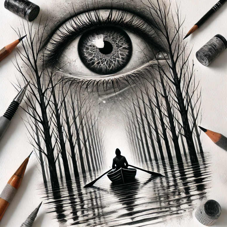 This grayscale pencil-style composition centers on an eye, whose iris ripples into a forest of tall, slender trunks that rise from a reflective shoreline. A lone rowboat carries a silhouetted figure, suggesting a solitary voyage through memory or introspection. The surrounding branches are rendered with fine-line precision, their branching patterns forming a subtle, pattern-like rhythm that can translate into bold skin ink. The water glosses with light reflections and ripples, while the eye’s cornea catches a bright highlight, lending a lifelike focal point. The piece uses strong black ink and soft grey gradients to create depth, contrast, and mood, making it suitable for a larger scale on the torso, back, or forearm where shading can breathe. The composition reads as a narrative of perception, threshold, and transformation: the eye as perception; the forest as growth or challenge; the boat as the journey through personal waters. The scattered pencils at the margins evoke the drawing process, reinforcing the concept of a design ready to be tattooed. From a technical standpoint, the design relies on clean edges for the trunks, careful cross-hatching for shading, and controlled negative space to preserve legibility on skin. If you’re seeking a cover-up, the dense black canopy and overlapping line work offer ample masking potential while preserving the story of the original tattoo. AI origin is acknowledged: these are AI-generated tattoo projects that explore graphic patterns and cover-up potential in a single, cinematic montage. For enthusiasts of meaningful tattoos, this design bridges realism and symbolism, delivers a versatile option for small tattoos or expansive sleeves, with potential adaptations in fine line tattoo technique, black and grey ink, and custom tattoo design.