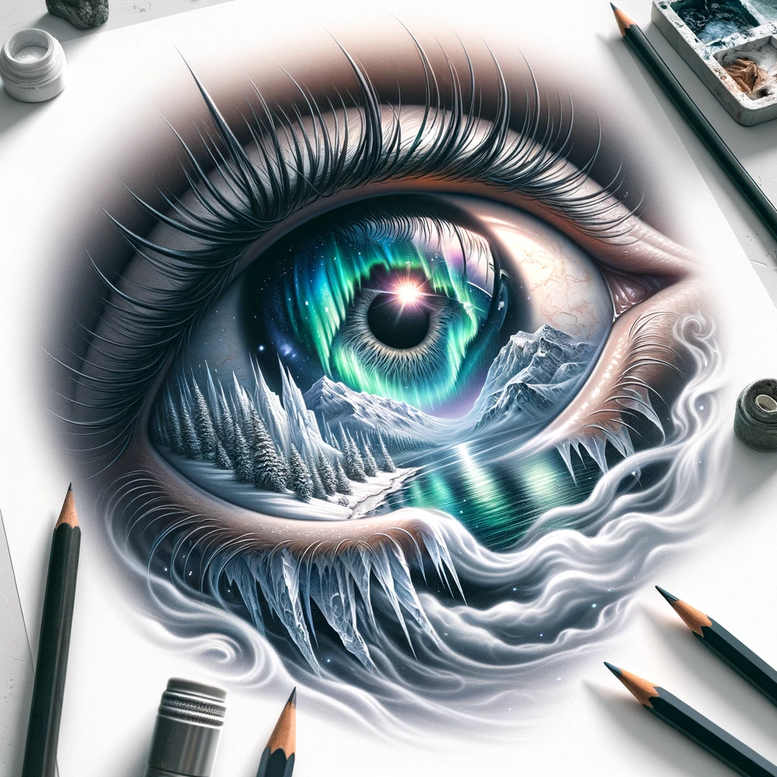 This is an AI-generated tattoo project concept presenting a surreal, highly detailed eye whose iris holds a miniature landscape: jagged mountains rise from the pupil, an emerald and teal aurora streaks across a starry sky, and a reflective lake echoes the icy surroundings. The outer sclera and eyelids flow with soft shading and delicate fine line detail in the eyelashes, blending realism with dreamlike fantasy. The color palette centers on full color: emerald greens, icy blues, frosty whites, and subtle skin-tone highlights that anchor the scene to the body as a living canvas. The ice-capped peaks and crystalline icicles around the eye create a graphic, pattern-like texture that enhances depth and movement, while the water reflection adds a serene counterpoint to the dynamic skyline. Symbolically, the eye represents perception and insight, with the mountains standing for endurance and the aurora signaling wonder, exploration, and a guiding light beyond ordinary vision. This tattoo design embraces contemporary trends in realism-infused body art, combining landscape imagery with anatomy to form a bold, statement piece suitable for larger areas such as the shoulder or back. It aligns with themes of meaningful tattoos and custom tattoo design, offering a vivid alternative to traditional black-and-grey work while remaining versatile for both color-rich and refined monochrome executions. As an AI-generated tattoo project, it demonstrates the potential of digital artistry to translate complex natural scenes into durable, wearable ink that resonates with lovers of modern Japanese-influenced flow, fine line precision, and dramatic color storytelling.