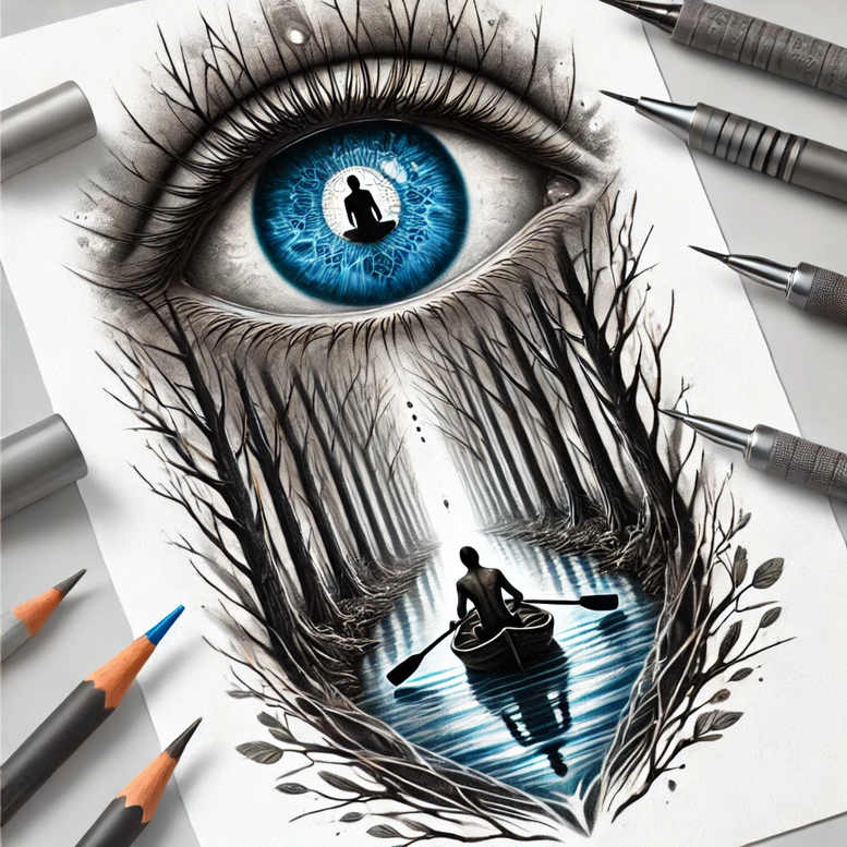 This AI-generated tattoo project concept fuses a vivid blue iris with a moody landscape that unfolds across the skin in a single, cohesive image. The central motif is an eye whose blue pupil and iris become a window into a forest and river scene, where a solitary rower powers a small boat along a blue-tinted current. Black silhouettes of bare trees rise in a framing arc around the waterway, their branches forming a pattern-like border that guides the eye toward the boat and back into the eye itself. The piece employs meticulous fine-line technique and restrained black-and-grey shading, with selectively placed blue accents to highlight the iris and the river, producing a cool, cinematic contrast that remains legible on smaller canvases. Symbolically, the eye suggests perception and introspection, the forest embodies resilience, and the river signifies passage and life’s ongoing flow; the lone rower adds a human scale to a vast natural environment, inviting viewers to consider their own journey. From a practical standpoint, the composition reads as a versatile tattoo design suitable for a variety of body areas, thanks to its clear negative space and structured rhythm; the repetition of tree silhouettes creates a distinctive rhythm that can help disguise minor scarring while preserving detail in larger panels. As an AI-generated concept, it aligns with contemporary trends in tattoo design that emphasize meaningful tattoos and the refined beauty of black-and-grey ink, while blue highlights expand the palette toward smaller tattoos and flower tattoos aesthetics. Keywords such as tattoo, tattoo design, meaningful tattoos, fine line tattoo, lotus flower tattoo, infinity tattoo, tribal tattoo, rose tattoo design, small tattoos, flower tattoos, custom tattoo design, Japanese style tattoo, black and grey, realistic tattoo, body art, ink anchor the concept for search visibility.