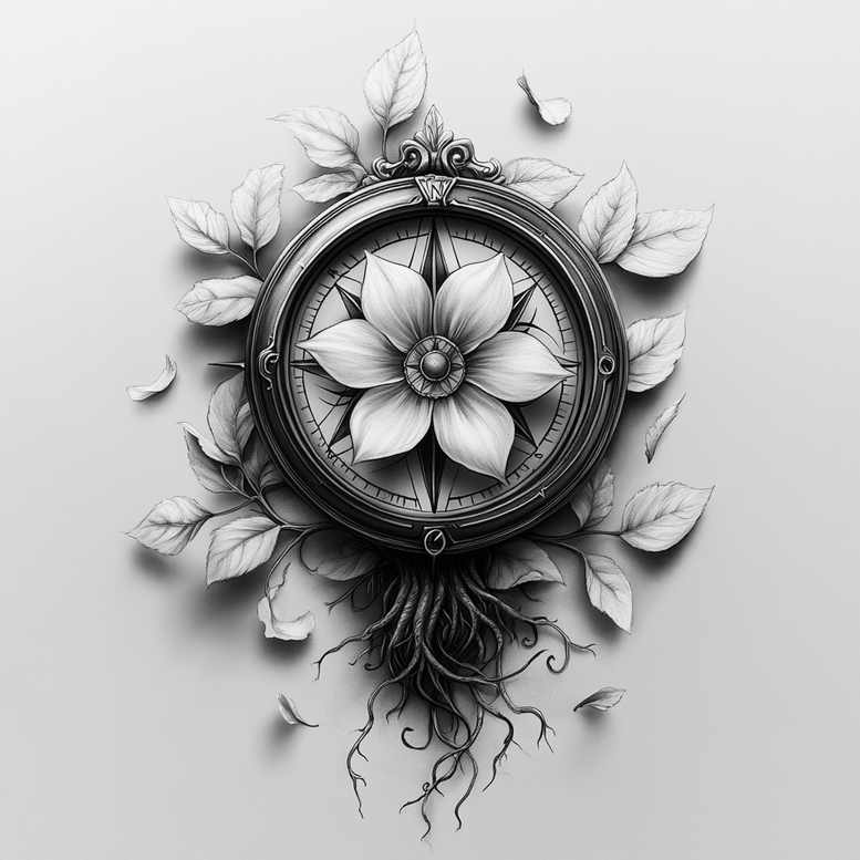 This black-and-grey tattoo concept centers on a compass rose, its circular frame housing a blooming flower with broad petals that evoke a lotus-like focal point. Leaves radiate around the circle, while slender roots extend downward, grounding the design in nature and navigation. Executed in a refined fine-line style with soft shading, the piece blends scientific precision with organic softness, creating a balanced composition suitable for placement on the forearm, shoulder, or upper back. The compass dial carries subtle markings and a central hub, suggesting guidance, direction, and a journey of self-discovery, while the central flower symbolizes growth, renewal, and resilience. The surrounding leaves soften the edges and bring a botanical atmosphere, making the overall tattoo design elegant and timeless. In contemporary tattoo design trends, this concept embraces meaningful tattoos and small-to-medium scale body art. The integration of linear precision and natural anatomy allows the piece to wrap gracefully around limbs, with shading building depth and a realistic touch. As an AI-generated tattoo project, it demonstrates how digital artistry can inform traditional tattoo concepts, combining realistic linework with decorative floral elements. The color treatment emphasizes contrast and texture through black and grey shading, enabling deep tonal range and subtle gradients. For those seeking a custom tattoo design that reads as map and blossom, this piece can be adapted to various body contours while preserving its symbolic meaning. It nods to nautical motifs, while retaining botanical symbolism that appeals to lovers of nature-inspired ink; it also aligns with keywords such as tattoo, tattoo design, meaningful tattoos, fine line tattoo, lotus flower tattoo, infinity tattoo, tribal tattoo, rose tattoo design, small tattoos, flower tattoos, custom tattoo design, Japanese style tattoo, black and grey, realistic tattoo, body art, ink.