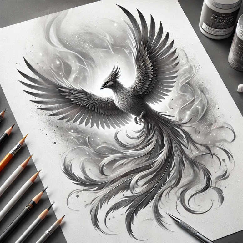 This AI-generated tattoo project presents a black and grey phoenix rendered in a fine line style, with meticulously layered feathers and a sweeping tail that curls into airy wisps. The bird is captured in ascent, its head turned with a focused gaze, the beak and eye subtly shaded to convey intensity. Each feather is carved with crisp line work that builds depth through delicate gradients, while the surrounding negative space and soft smoke-like swirls give the composition a sense of motion and ethereal atmosphere. The design sits on a white canvas, surrounded by studio elements such as pencils and bottles that reinforce its origin as a custom tattoo idea. The concept blends realism with pattern-like rhythm that translates well into a tattoo design with a bold silhouette and refined detail, ideal for larger placements or intricate small work in black and grey ink. The phoenix symbolizes rebirth, resilience, and transformation, making this a meaningful tattoo choice for those seeking renewal or commemoration. For cover-up considerations, the dense black shading of the core and the bold curvature of the tail provide dependable concealment while preserving fine line precision. Adaptable to Japanese-inspired line work or maintained in a contemporary Western fine line aesthetic, this concept offers versatility across styles and body placements. In sum, this is a thoughtfully composed, AI-generated tattoo project that demonstrates how a single mythical creature can carry enduring symbolism, technical finesse, and visual impact in a timeless black and grey tattoo design.