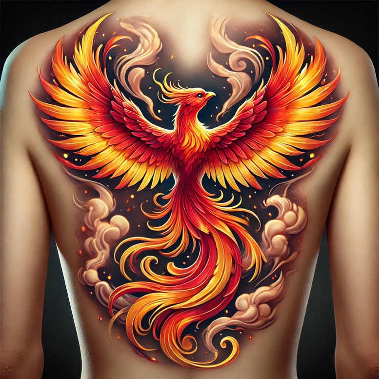 AI-generated tattoo project concept: a large back piece featuring a phoenix rising amid swirling clouds and flame, rendered in saturated orange, red, and yellow. The design emphasizes dynamic movement and intricate feather detailing, with gradients that simulate heat and glow. The phoenix’s wings span the shoulders, its tail curling down the spine; smoke-like wisps frame the center, adding depth and contrast against a dark background. The approach blends realistic shading with painterly strokes to create a bold, museum-quality tattoo design reading as myth and power. This back piece serves as a meaningful tattoo concept for those drawn to rebirth symbolism or resilience. Key elements include the phoenix formed from flowing plumage, the surrounding smoke swirls, and ember-like sparks that punctuate the composition. Executed in full color, the piece relies on vibrant warm hues to convey heat and energy; a black and grey version could be explored for a subtler take. Technique-wise, smooth gradients on the plumage, fine line texture on individual feathers, and soft airbrush shading for the clouds maximize depth and realism. The composition centers the phoenix on the back with wings spread across the shoulder blades, ensuring legibility from distance while rewarding close inspection. While this is an AI-origin concept, the design translates well into a custom tattoo design for large-scale body art and fits contemporary trends in realistic tattooing and Japanese style flame motifs. The pattern-like repetition of feather shapes creates cohesion, and the overall contrast against skin tone makes the piece glow as a bold statement of life and renewal, suitable for meaningful tattoos or back pieces for ink enthusiasts.
