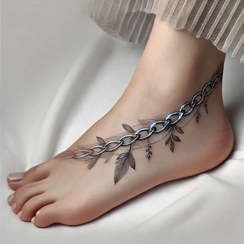 This tattoo concept presents a slender fine-line ankle wrap where a metallic chain coils around the foot and rises along the ankle, interlaced with delicate leaf sprigs and tiny bead-like accents. Executed in black ink with soft gray shading, the chain links anchor the composition while hairline lines suggest movement across the skin. Leaves extend along the chain, their veins rendered in fine detail to create depth without overwhelming the silhouette. The hanging beads—represented by short dot-like droplets—add micro-dimension and catch the eye as the leg moves. This tattoo design blends botanical symbolism with geometric rhythm, conveying connection, growth, and continuity. In a pattern-focused approach, the repeated loops and linear elements read clearly at both small and larger scales, making it suitable for a discreet ankle tattoo or for expanding into a larger leg piece if desired. The black-and-grey palette keeps the look timeless and versatile, ideal for a refined, mature audience who appreciates fine line tattoo aesthetics. For clients seeking a meaningful tattoo design with subtle complexity, this concept offers adjustable chain width, leaf size, and bead spacing to tailor to individual anatomy and skin tone. AI origin: this is an AI-generated tattoo project illustrating a possible ankle wrap that can function as a standout design or serve as a cover-up with enhanced negative space and overlapping lines. The artwork emphasizes clean line work, careful shading, and a natural flow that respects the contours of the foot, ensuring legibility over time. In short, this tattoo design embodies contemporary body art values—minimalism, precision, and longevity—and leverages keywords like tattoo, tattoo design, meaningful tattoos, fine line tattoo, lotus flower tattoo, infinity tattoo, tribal tattoo, rose tattoo design, small tattoos, flower tattoos, custom tattoo design, Japanese style tattoo, black and grey, realistic tattoo, body art, ink.