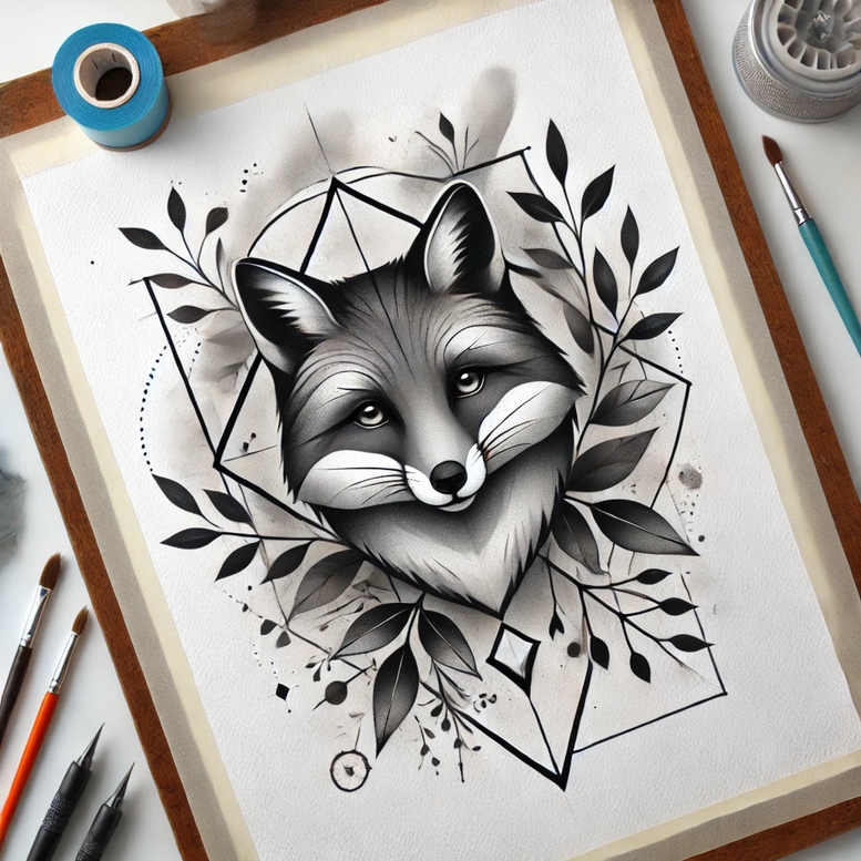 This AI-generated tattoo project concept presents a black-and-grey fox portrait framed by a geometric structure and trailing botanical accents. The fox head is rendered with smooth grayscale gradients that capture fur texture and depth, while crisp polygonal lines form a surrounding frame, creating a dynamic tension between natural form and engineered geometry. Leaves and fine branches weave through the composition, guiding the eye along negative space and balancing the weight of the animal image with airy, organic motion. The result is a contemporary tattoo design that sits comfortably on forearms, shoulders, or calves, where a mid-size piece can showcase both fidelity and bold graphic contrast. Symbolically, the fox embodies cunning and adaptability, while the leaves suggest growth and renewal; together they tell a meaningful tattoo story about change, resilience, and personal transformation. The grayscale palette emphasizes contrast, shading, and line quality—qualities that support a realistic tattoo vibe while remaining adaptable to other styles such as Japanese style tattoo or subtle pattern work. As a versatile ink study, this concept also lends itself to expansion: the geometric frame can be extended into sleeves or back pieces, and the leaf motifs can be repeated to form a cohesive botanical pattern without overpowering the central fox portrait. For clients seeking small tattoos or larger body art with a modern edge, this design offers a clean, timeless option that pairs well with lotus flower tattoo or rose tattoo design influences, and it serves as a compelling example of a custom tattoo design crafted for ink and body art enthusiasts. The pattern-based geometry, combined with a lifelike fox, creates a versatile template that artists can adapt to placement, scale, and personal symbolism, while maintaining strong visual impact across styles and eras.