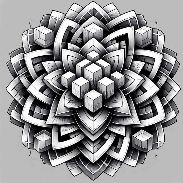 An AI-generated tattoo project, this concept presents a geometric mandala formed by interlocking petals and a central cluster of stacked cubes; the grayscale rendering emphasizes contrast, depth, and precision. The central cube arrangement anchors the composition, while the layered petal motifs radiate outward in a symmetrical, architectural pattern. Shading combines smooth gradients with crisp linework to create a tactile sense of volume that translates well on skin as a black and grey tattoo. The design harmonizes geometric rigor with organic curves, blending mathematical balance with the flowing energy of mandalas. In terms of symbolism, mandalas signify wholeness and mindfulness, while cubes evoke structure and stability; together they suggest controlled growth and deliberate transformation—qualities appealing to someone seeking a meaningful tattoo design. The piece offers a wide range of sizing options: it can be scaled to a small placement with fine-line details or expanded into a larger canvas such as a back or chest piece, where the intricacy of the pattern can be fully appreciated. The grayscale palette emphasizes depth and texture and makes this concept particularly suited for cover-up projects, as the dense shading can effectively mask previous ink while introducing a contemporary geometric motif. The image demonstrates how AI-generated tattoo projects can inspire custom tattoo design, inviting conversations about technique, line quality, and the translation of digital concepts into real-world ink. For style versatility, the motif pairs well with Japanese-style tattoo influences, black and grey realism, or modern tribal geometry, while retaining clean lines and balance characteristic of fine-line tattoo aesthetics. This description intentionally weaves in keywords such as tattoo, tattoo design, meaningful tattoos, fine line tattoo, lotus flower tattoo, infinity tattoo, tribal tattoo, rose tattoo design, small tattoos, flower tattoos, custom tattoo design, Japanese style tattoo, black and grey, realistic tattoo, body art, ink.