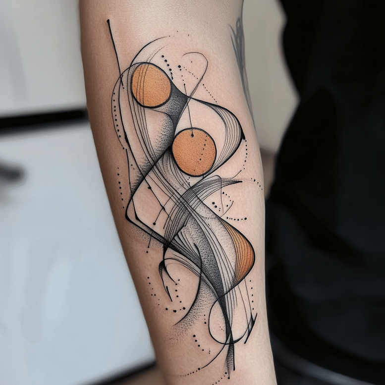 This is an AI-generated tattoo project featuring an abstract, graphic pattern of interlacing ribbons, dots, and two orange circles. Black linework sweeps in fluid curves that cross and loop, with selective tapering to create depth and motion. The orange fills sit as bold anchors, their solid discs contrasting with fine-line tracings and stippled shading along the edges. Dotted motifs punctuate the composition, guiding the eye along a serpentine path and giving a sense of rhythm. The balance between negative space and dense ink makes the design legible as a standalone piece on the forearm or calf, while its flow pairs beautifully with larger sleeves or additional motifs. Symbolically, the twin circles can suggest unity, cycles, or personal anchors, while the looping ribbons express connection and evolution. Technique-wise, this concept leans on fine-line tattoo aesthetics: precise, clean lines, subtle gradient shading, and crisp edge definition to ensure longevity. The two-tone color approach—black and orange—yields a modern, approachable look that remains versatile when scaled down to small tattoos or enlarged for impactful body art. The artwork draws inspiration from contemporary abstract art and Japanese-style fluidity, offering a design that feels both timeless and current. As an AI-generated concept, it demonstrates how algorithms can inspire meaningful tattoos and serve as a precise brief for tattoo artists to execute with confidence. For discoverability, this design aligns with keywords such as tattoo design, meaningful tattoos, fine line tattoo, abstract pattern, black and orange, custom tattoo design, and versatile body art suitable for a range of placements. The graphic pattern invites interpretation and can be paired with additional elements to personalize the meaning.
