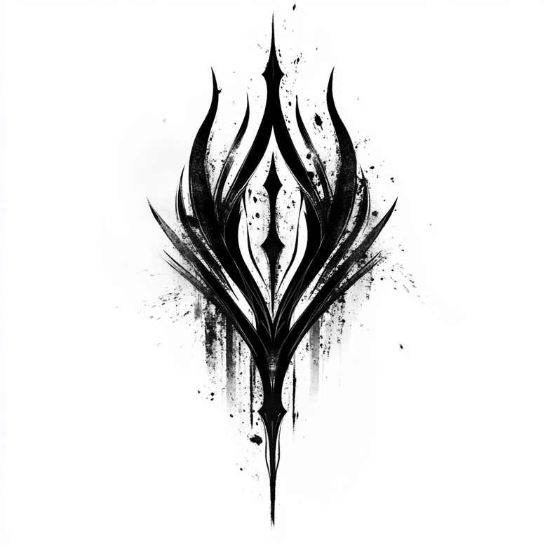 AI-generated tattoo project concept presented as a bold black and grey tribal blade motif. The design centers on a symmetrical dagger-like silhouette formed by tapering, flame-inspired blades that converge at a pointed tip, with sharp arches rising into spires and ink splatters along the sides to create a controlled splash of energy. The overall composition leans into a graphic pattern aesthetic, ideal for modern body art enthusiasts who favor strong line work over dense shading. As an AI-generated concept, it can adapt to different placements and skin tones, from forearms to calves, while preserving a striking silhouette. Given its darkness and high tonal value, this piece is especially well-suited as a cover-up design, offering ample negative space around the central motif to mask underlying work. The blades’ sweeping curves evoke themes of rebirth and resilience, while the mirror-like symmetry nods to infinity tattoo aesthetics through repetition and balance. In a custom tattoo design context, subtle gray washes could be added for depth, or the pattern can be kept solid black for a high-contrast look. The concept supports various adaptations, including minor tweaks to line weight, spacing, and scaling for small tattoos or larger back pieces, and it resonates with keywords such as tattoo, tattoo design, meaningful tattoos, tribal tattoo, black and grey, body art, and ink. For clients drawn to lotus flower tattoo, rose tattoo design, or Japanese style tattoo influences, the piece offers a bold platform to explore symbolism while remaining readable on skin. This is a versatile, cover-up-friendly, graphic option that translates well into professional execution, maintaining a timeless silhouette that remains legible at different sizes. The AI-generated nature of the project invites collaboration with artists who can refine the final ink lines, adjust shading if desired, and tailor the motif to personal meaning, making it a strong candidate for a custom tattoo design that pairs striking visuals with personal narrative.