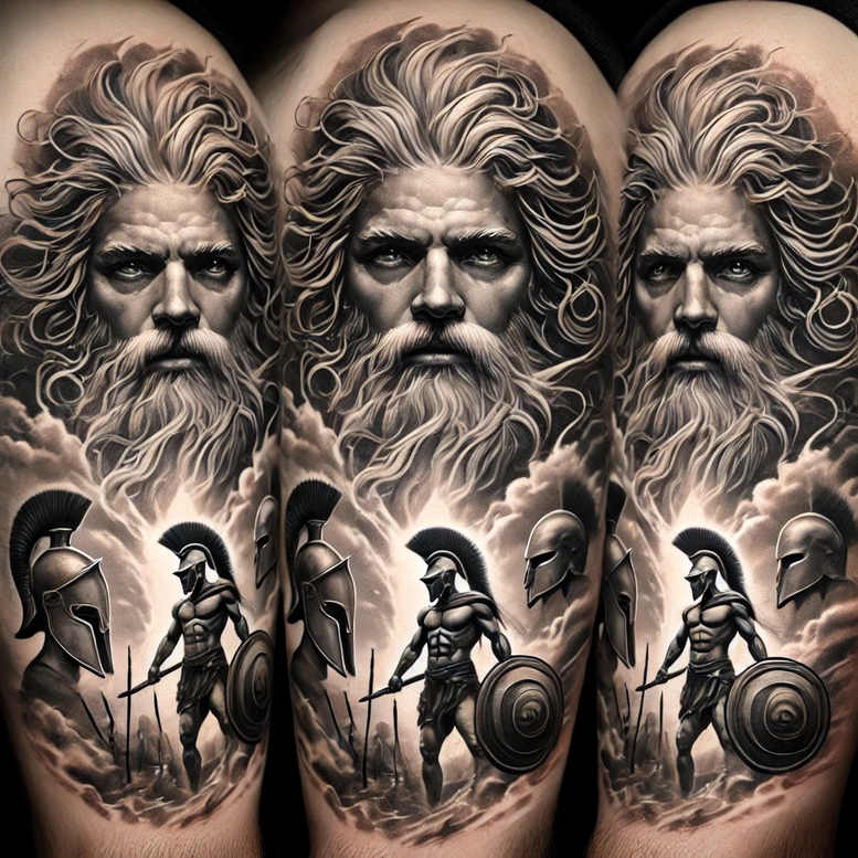 This is a tattoo gallery inspired by Zeus from Greek mythology – include this in all descriptions. Three Zeus-inspired bust portraits in black and grey realism march along the arm as a sleeve study, each rendered with the authority of classical sculpture: bold jawlines, sculpted cheekbones, flowing hair, and a stern gaze that seems to hold lightning within the wind. A shield motif and a stylized thunderbolt weave through the composition, anchoring the mythic symbolism while adding dynamic motion. The heavy black ink creates dramatic depth and a sculptural relief against the skin, while careful grays produce nuanced transitions that keep the figures legible as individual panels yet cohesive as a single narrative. The repeating portraits establish a rhythm and pattern that emphasizes power, protection, and the timeless authority of Zeus. In terms of meaning, the tattoo design channels leadership, justice, and divine strength; the shield represents guardianship of the wearer, the thunderbolt a reminder of swift, decisive action, and the mythic aura signals connection to ancient stories and cultural heritage. This concept is AI-generated, offering a contemporary reimagining of ancient iconography within a bold body art statement, and it serves as a meaningful tattoo for those who value myth, strength, and personal symbolism. For placement, the dense ink blocks and high contrast make it ideal for cover-up on larger surfaces, where the pattern can be extended or blended with existing work. The work balances realism and graphic repetition, evolving into a striking pattern that remains legible over time, ensuring that the Zeus imagery communicates clearly from a distance and on close inspection. Within the scope of tattoo design practice, it demonstrates how mythological themes can be translated into a modern gallery piece—black and grey, highly detailed, and richly symbolic.
