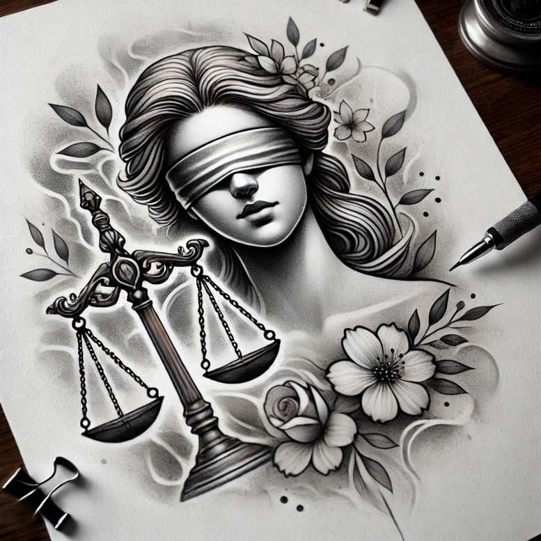 This black and grey realism tattoo design concept centers a poised Themis, the Greek goddess of justice, her eyes veiled by a tight blindfold and her hand balancing the delicate scales. Surrounding her form is a lush garland of flowers and leaves, arranged to echo rhythm and movement while framing the figure with botanical detail. The composition blends classical symbolism with contemporary tattoo technique, employing fine line detailing and smooth gradient shading to create depth, texture, and a lifelike presence on the skin. The scales symbolize balance, impartial judgment, and moral equity, while the blindfold represents neutrality and objective truth—an eternal reminder that justice should be administered without bias. The floral elements inject life, growth, and beauty into the scene, suggesting that law and order coexist with nature’s vitality. The grayscale palette emphasizes tonal contrast, from the darkest shadows in the hair and folds of the robes to the soft highlights on petals and skin, producing a timeless and versatile artwork suitable for various body placements. The repeated floral motif provides rhythm and unity across the design, making it especially effective as a striking yet delicate piece for those seeking meaningful tattoos. As a concept, this is an AI-generated design idea that fits well within black and grey realism and can be adapted into a custom tattoo design with customizable scale and placement. The interpretation invites personal touches—such as additional inscriptions or substituted flowers like lotus or rose—that deepen the bearer’s narrative while preserving Themis symbolism: justice, balance, and moral integrity guiding the wearer through life’s complexities. In essence, this tattoo concept merges mythic symbolism with modern ink technique to create a powerful, enduring body art statement about fairness, responsibility, and human aspiration.