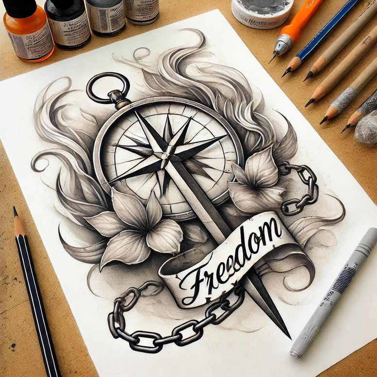Presented as a high-contrast grayscale tattoo concept, this piece centers on a compass surrounded by interwoven chain links and blooming flowers, with a dagger crossing the compass and a banner inscribed Freedom. Executed in black and grey, the shading builds form and depth, from the metallic sheen of the dagger to the soft gradations on the petals, creating a realistic tattoo aesthetic that reads clearly at typical tattoo sizes. The compass suggests direction, guidance, and resilience, while the dagger introduces an edge of protection and determination; the banner with ‘Freedom’ serves as a personal motto, anchoring the design in meaning. The surrounding chain implies connection and strength, while the flowers add organic contrast and a touch of life to the composition. The overall layout appears balanced for placement on a forearm or upper arm, with the ribbon providing a focal point that guides the eye through the piece. The grayscale palette ensures compatibility with varied skin tones and ages well with future touch-ups, making it a versatile choice for a timeless tattoo. This artwork is presented as an AI-generated tattoo project, illustrating how digital concepts translate into traditional tattoo cues and how fine-line detailing in the floral elements complements the bold geometry of the compass and dagger. In terms of symbolism, the combination of direction, freedom, and resilience resonates with meaningful tattoos, appealing to those seeking a custom tattoo design that blends nautical and natural motifs, and to fans of black and grey realism, floral tattoos, and strong, legible ink lines. If the client desires a cover-up, the grayscale shading and high-contrast elements can be adapted to darken or alter existing ink, offering flexibility for future revisions.