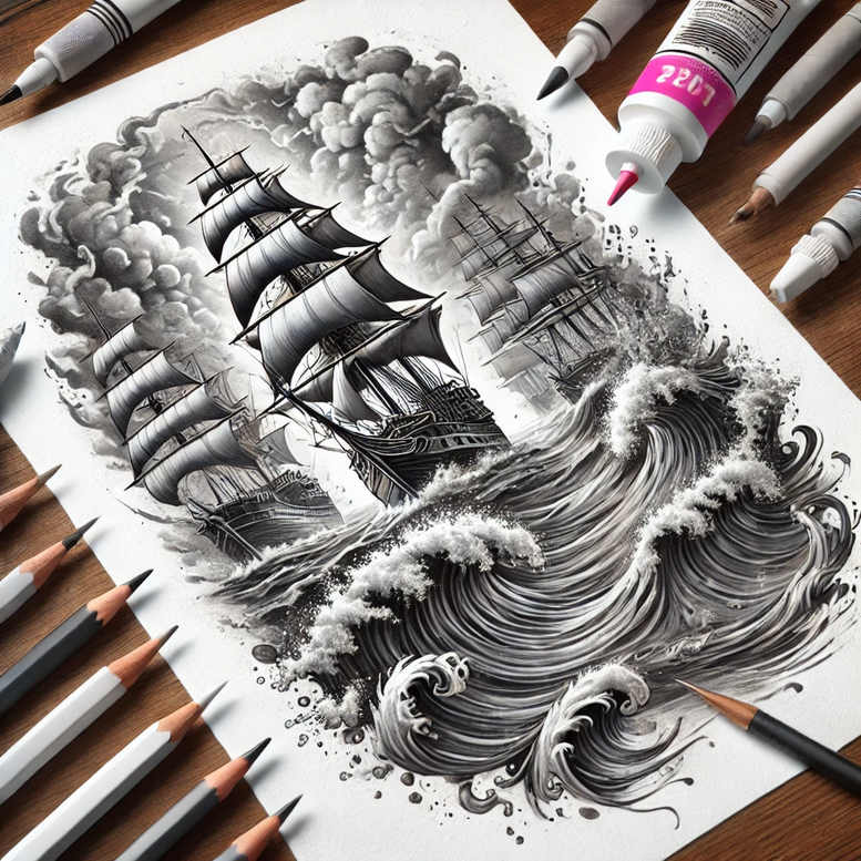 AI-generated tattoo project concept, this ink drawing portrays a tall-mast ship caught in a furious sea, rendered in black and grey with dense line work and dynamic wave patterns. The composition centers on the ship’s sails and rigging, angled as if bracing against a cyclonic swell, while crests burst into froth and spray. Clouds above add depth and motion, creating a chiaroscuro effect that emphasizes contrast and texture. The piece reads as a finished tattoo design and also functions as a strong concept for a back or sleeve piece. The dark palette makes it particularly suitable for a cover-up, as heavy shading can obscure underlining marks beneath a bold silhouette. Fine line detailing captures the rigging’s intricacy and the waves’ curl, with a nod to traditional nautical imagery and Japanese stylistic hints in rhythm and spacing. Patterned wave textures and stippled clouds add a graphic rhythm to the piece, enhancing its suitability for a cover-up. Symbolically, the voyage through stormy seas embodies resilience and determination, a personal tale of navigating life’s tempests. For a tattoo artist, the composition offers clear focal points—ship, sail, wave—and room for additional elements or color highlights later. From a design perspective, it balances motion with negative space, ensuring readability on skin. This concept demonstrates how AI-generated artwork can inform precise ink-ready line work and shading, delivering a compelling piece of body art. Keywords include tattoo, tattoo design, meaningful tattoos, fine line tattoo, black and grey, realistic tattoo, and nautical motifs, with options for small tattoos or larger covers. The piece invites interpretation, making it suitable for personal storytelling through ink, and, as an AI-generated tattoo project, illustrates how digital concepts translate into a tangible tattoo design process, ready for inking and customizing.